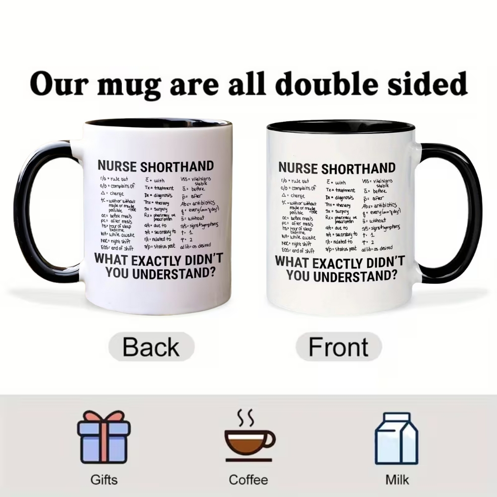 The 11oz Nurse Shorthand Print Ceramic Coffee Mug combines professional humor with practical design. Featuring double-sided printing on a classic white ceramic base, it makes a thoughtful gift for nurses, nursing students, and graduates. Suitable for coffee, tea, and everyday use, this mug brings a touch of nursing culture to daily beverage moments.