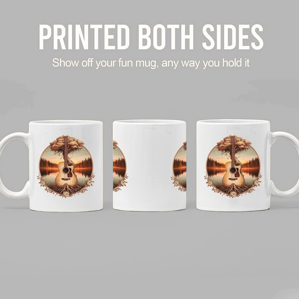Crafted from ceramic material, this mug offers structure and smooth finish. The white surface enhances the printed artwork, allowing the lake theme and guitar design to stand out clearly. The glossy exterior supports vibrant image reproduction that remains visible after repeated washing.
