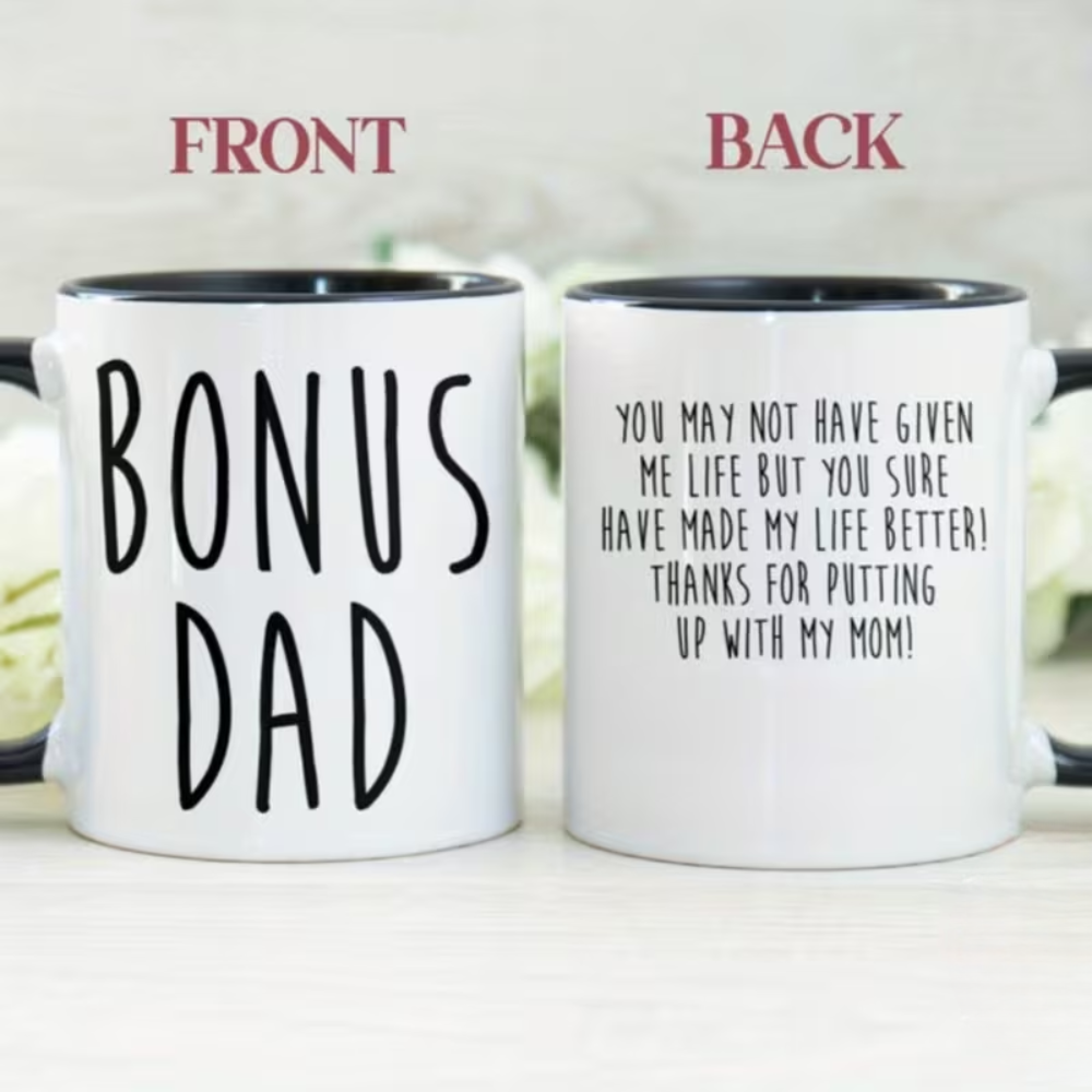 The Bonus Dad Text Printed Coffee Mug With Front And Back Quote features text printed on both sides, offering practical drinkware that includes a message of appreciation. With one side labeled Bonus Dad and the other side displaying a two-line quote, this mug serves as a functional gift item for a family occasion or daily use.