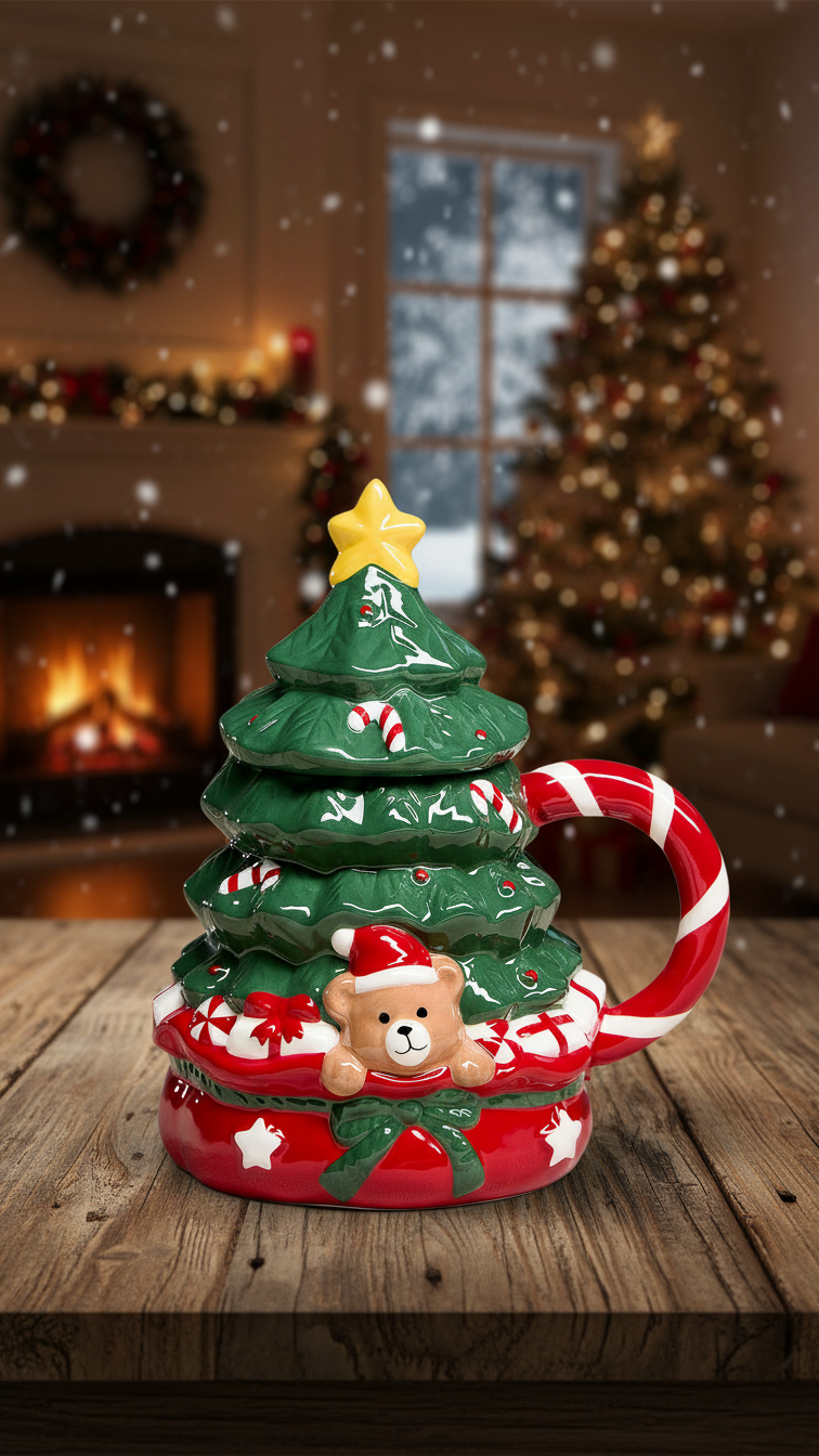 This Christmas Tree Ceramic Mug blends seasonal art with practical functionality. The detailed sculpting creates a decorative shape that captures the look of a layered Christmas tree. The shiny ceramic finish enhances each contour and adds visual depth to the overall design. The added bear figure introduces a joyful seasonal character that many households appreciate.