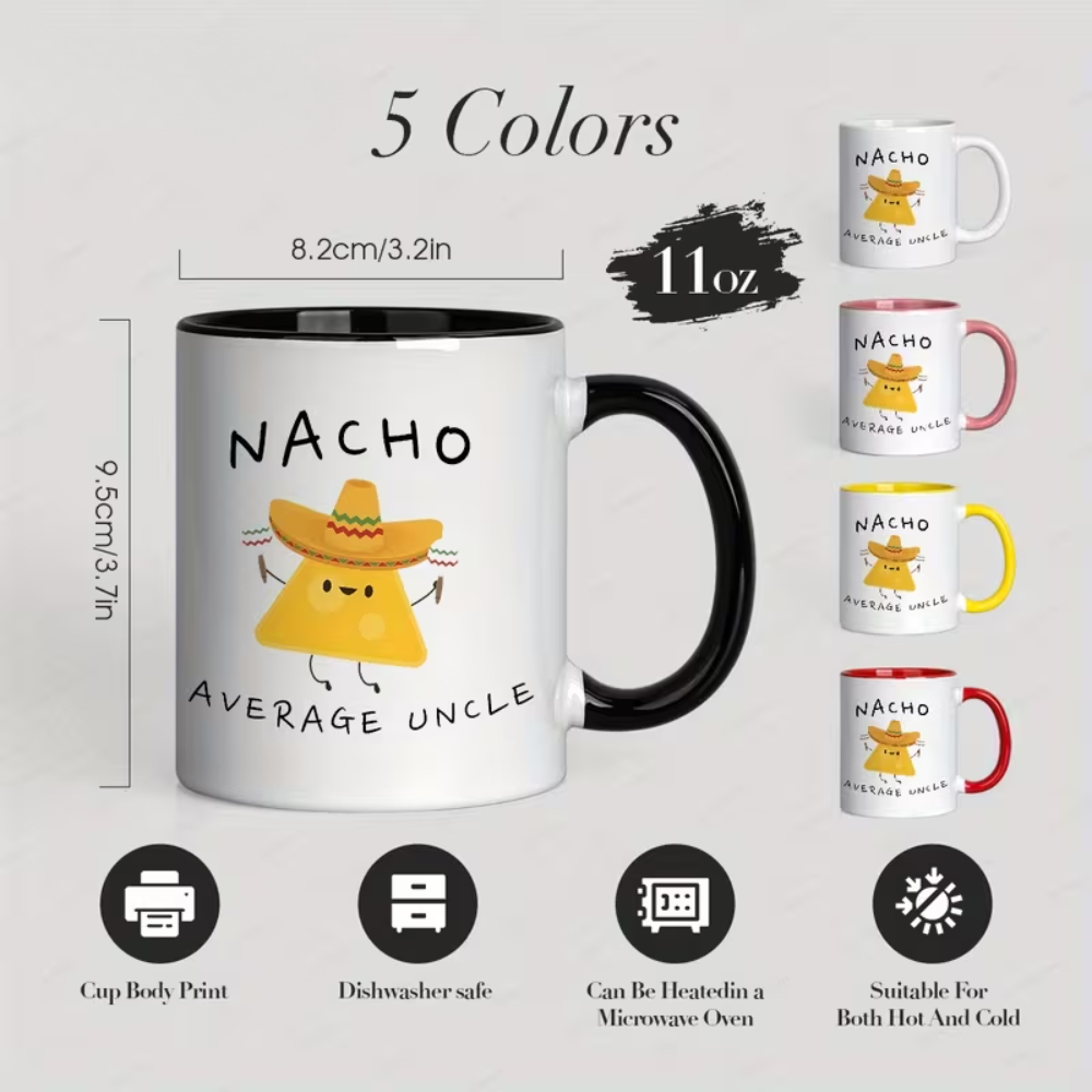 The Coffee Mug Nacho Average for Uncle is a message-and-graphic coffee mug made for gifting and everyday drink use. It features a fun “Nacho Average Uncle” theme with a nacho character illustration, making it a lighthearted choice for family occasions and casual gift-giving. With a classic mug shape and an easy-grip handle, it fits into daily routines at home, at a desk, or during family gatherings. The design is printed on the front for a clear display, and the mug format supports hot drinks such as coffee, tea, and cocoa, as well as cold beverages.