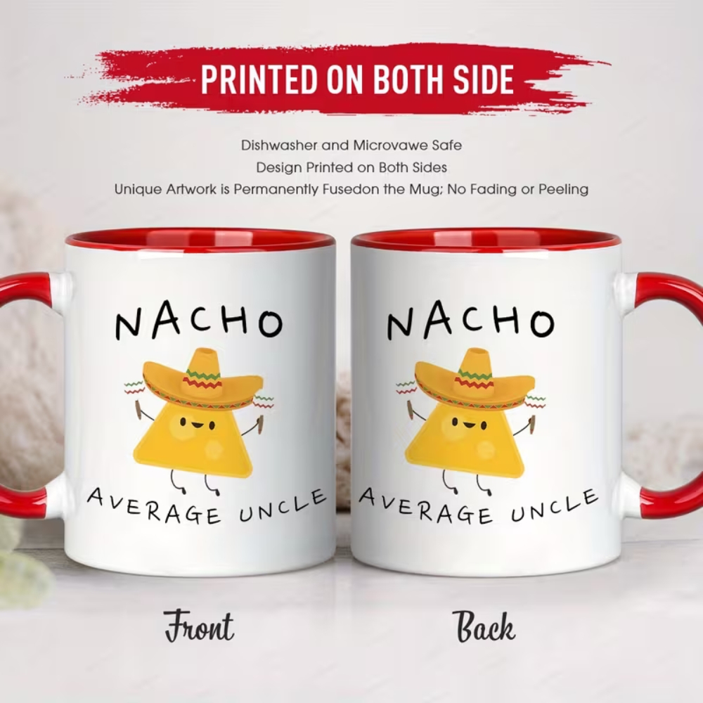 This mug can also be used beyond beverages. Many people use mugs as desk organizers for pens and small stationery items, or as a decorative shelf piece that adds personality to a kitchen corner or work area. The Nacho Average Mug Uncle suits those looking for a practical item with a humorous message that can be used regularly, not only kept for display. Its dishwasher-compatible feature makes cleaning convenient for repeated use, while the printed design keeps the theme visible each time it’s used.