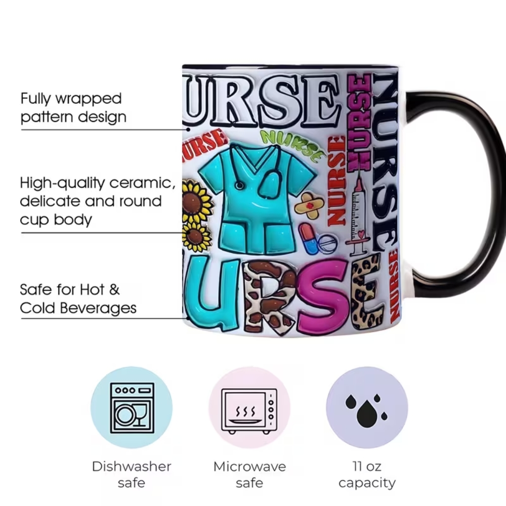 This nurse themed ceramic mug combines creative artwork with practical function. The colorful nursing elements pattern adds visual interest while maintaining a professional theme.