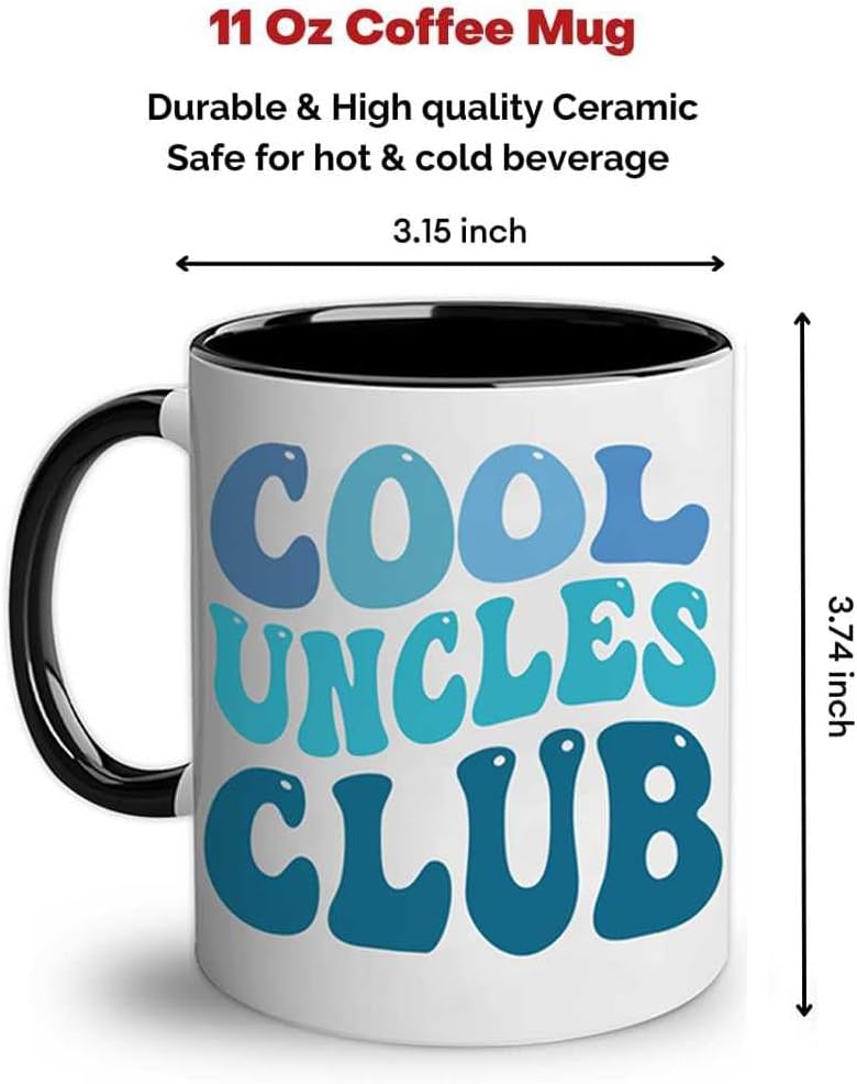 Designed for routine beverage use, this Cool Uncles Club Printed Ceramic Coffee Mug For Uncle supports hot and cold drinks in indoor environments. The side handle allows controlled grip, while the stable base supports placement on desks and countertops. Its printed “Cool Uncles Club” text design adds a visual element without affecting functionality. Suitable for kitchens, offices, or shared spaces, the mug supports repeated use with standard dishwasher and microwave care. The ceramic material maintains its structure during regular handling and washing. This mug offers a reusable drinkware option that fits into everyday beverage habits while maintaining a consistent printed appearance.