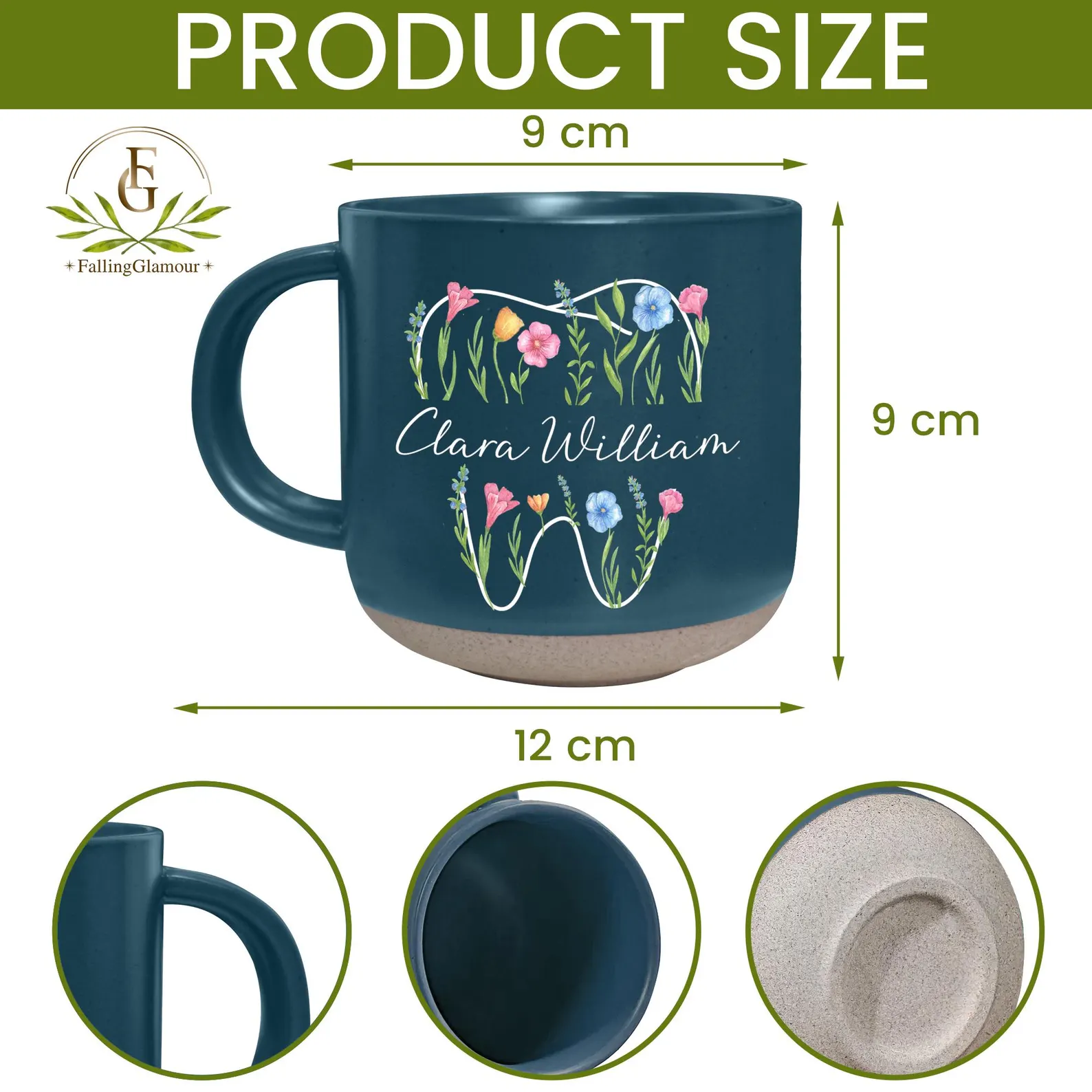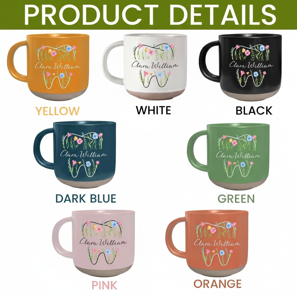 The Custom Floral Tooth Mug presents a simple yet effective format for regular drink usage. Its combination of ceramic material, printed floral design, and custom name application make it suitable for both personal and light workplace settings.