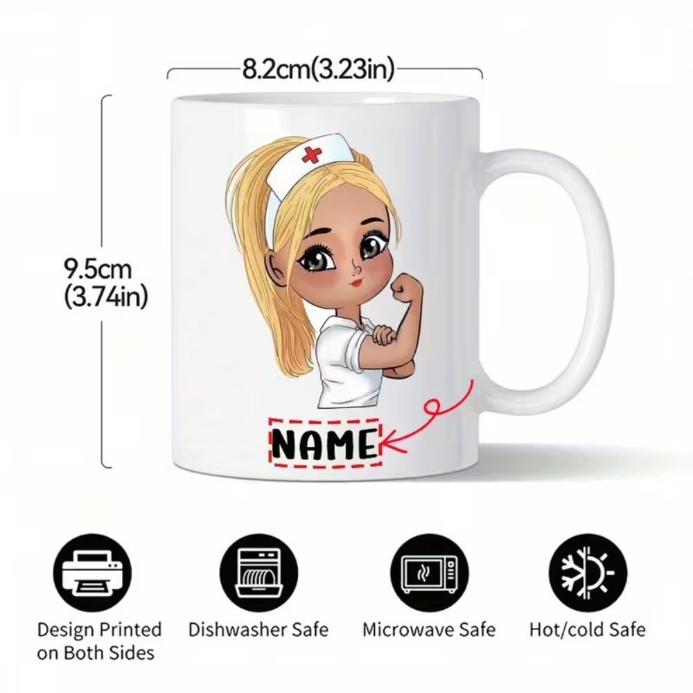 The Custom Nurse Cartoon Printed Coffee Mug combines personalization with a nurse illustration, making it both practical and meaningful. The ceramic construction ensures long-term use, while the customizable name adds a personal look that makes each mug different.