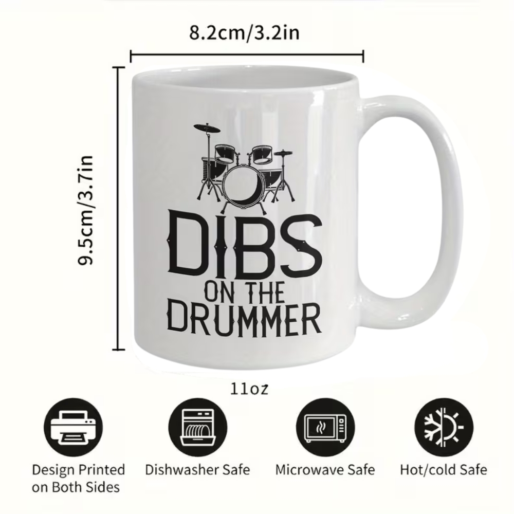 The Dibs On The Drummer Text Print 11oz Musician Coffee Mug delivers humor and practicality in one stylish ceramic cup. With its reusable construction, microwave compatibility, and bold letter print design, it is suitable for everyday beverages and festive gift occasions. Add a cheerful rhythm-inspired touch to coffee or tea time with this drummer-themed mug.