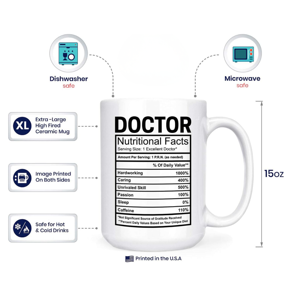 This Doctor Nutritional Facts Printed 15 Oz Double Sided Coffee Mug presents a structured layout designed for daily usage in shared work areas or personal kitchen setups. The exterior features printed text on both sides, visible from multiple angles when placed on a desk, shelf, or table. This item is commonly used in professional or academic environments where simple formats are preferred over complex or ornamental items.