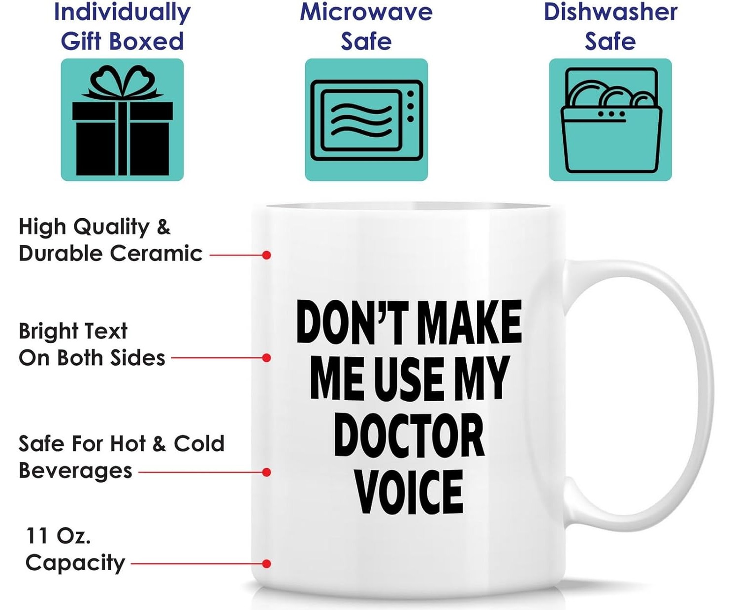 The Dont Make Me Use My Doctor Voice Text Printed 11 Oz Coffee Mug is a ceramic beverage holder designed for everyday functionality. Whether used at a work desk or during early mornings, this mug provides a simple way to hold your drinks while of printed text. The quote reads clearly on both sides, offering visibility whether the mug is set down or lifted.