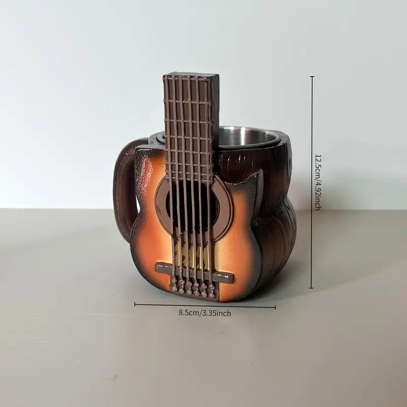 - Electric guitar shaped coffee mug – handle designed as a guitar neck with artistic detailing