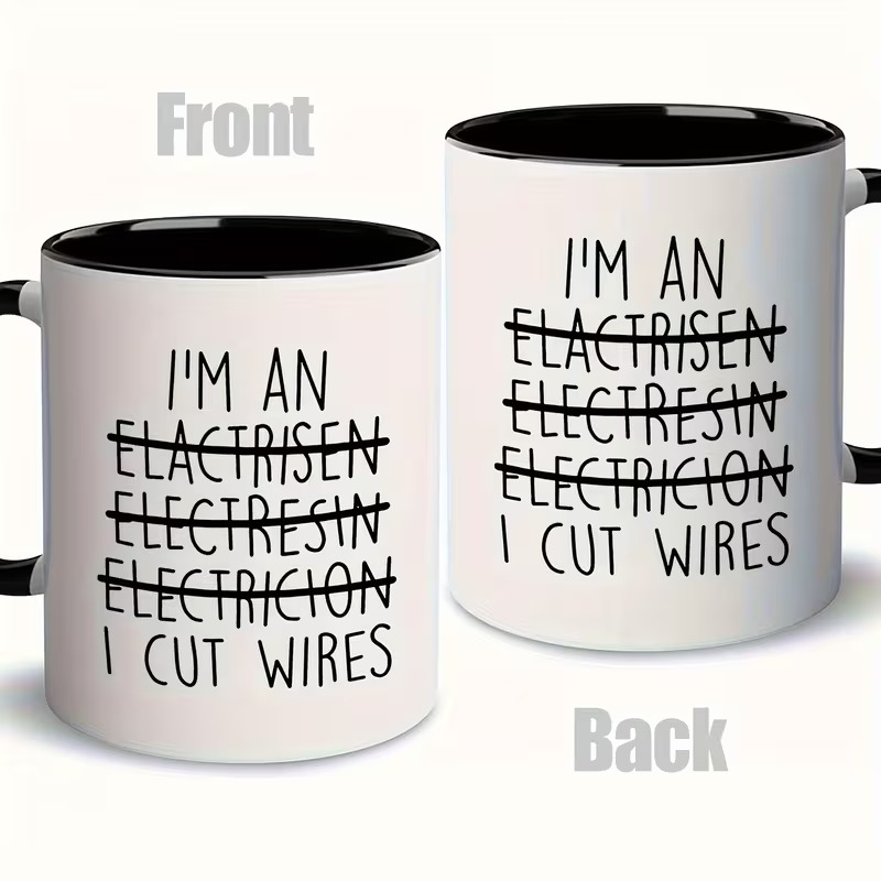 As an 11oz ceramic mug, Electrician I Cut Wires is sized for common coffee and tea servings. It works well for morning routines, break-time drinks, or a warm beverage during desk time. The print is placed for clear visibility, so the text remains readable whether the mug is sitting on a counter, placed beside a laptop, or stored in a cabinet. If you prefer a minimal graphic approach that relies on typography rather than illustrations, this mug delivers the theme through a straightforward layout and a crisp text presentation.