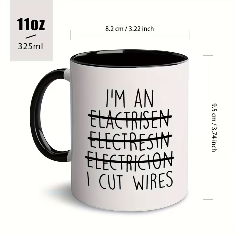 The Electrician I Cut Wires mug is a ceramic 11oz coffee mug featuring a crossed-out text layout that ends with the phrase “I cut wires.” With a classic round shape, standard handle, and a clear, typography-focused design, it fits daily routines in family kitchens, home offices, and shared spaces. Care guidance is simple: wash only, use mild soap and warm water, and avoid abrasive tools to help maintain the printed design over time.