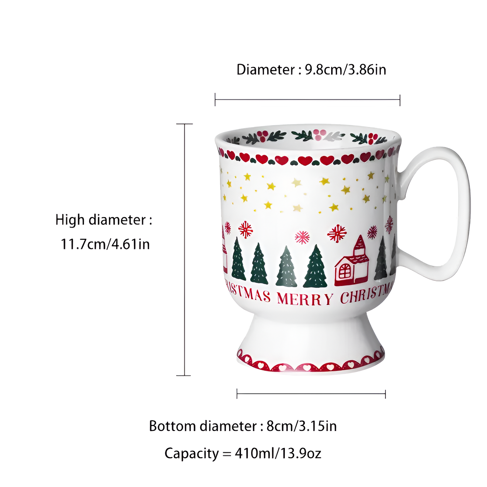 As a Holiday Coffee Mug, the item is styled for winter beverages commonly served during celebratory months. It fits into seasonal kitchens, break rooms, and event setups. Its size supports standard pours without spillage.