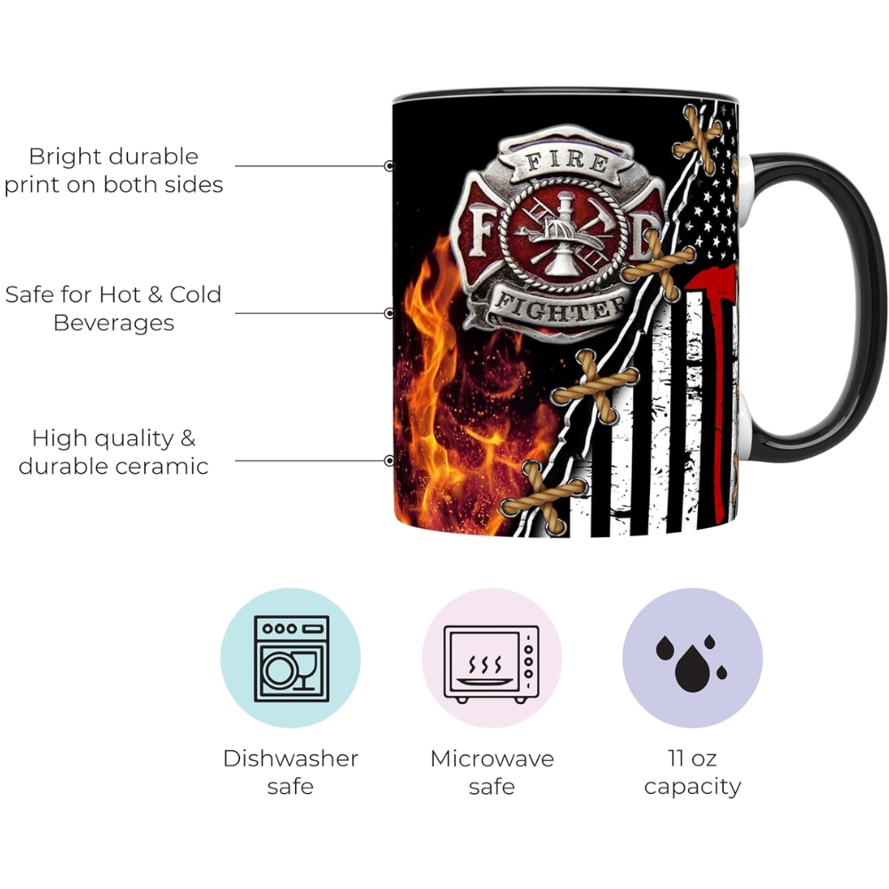 The Firefighter Printed With Flag Design Ceramic Coffee Mug features a bold firefighter crest, patriotic flag design, and flame artwork. Crafted from ceramic with a black handle and 11-ounce capacity, it is microwave and dishwasher compatible. Ideal as a Fireman Graduation Gift or Fire Department Crest Mug, it blends symbolism and practicality for daily use.