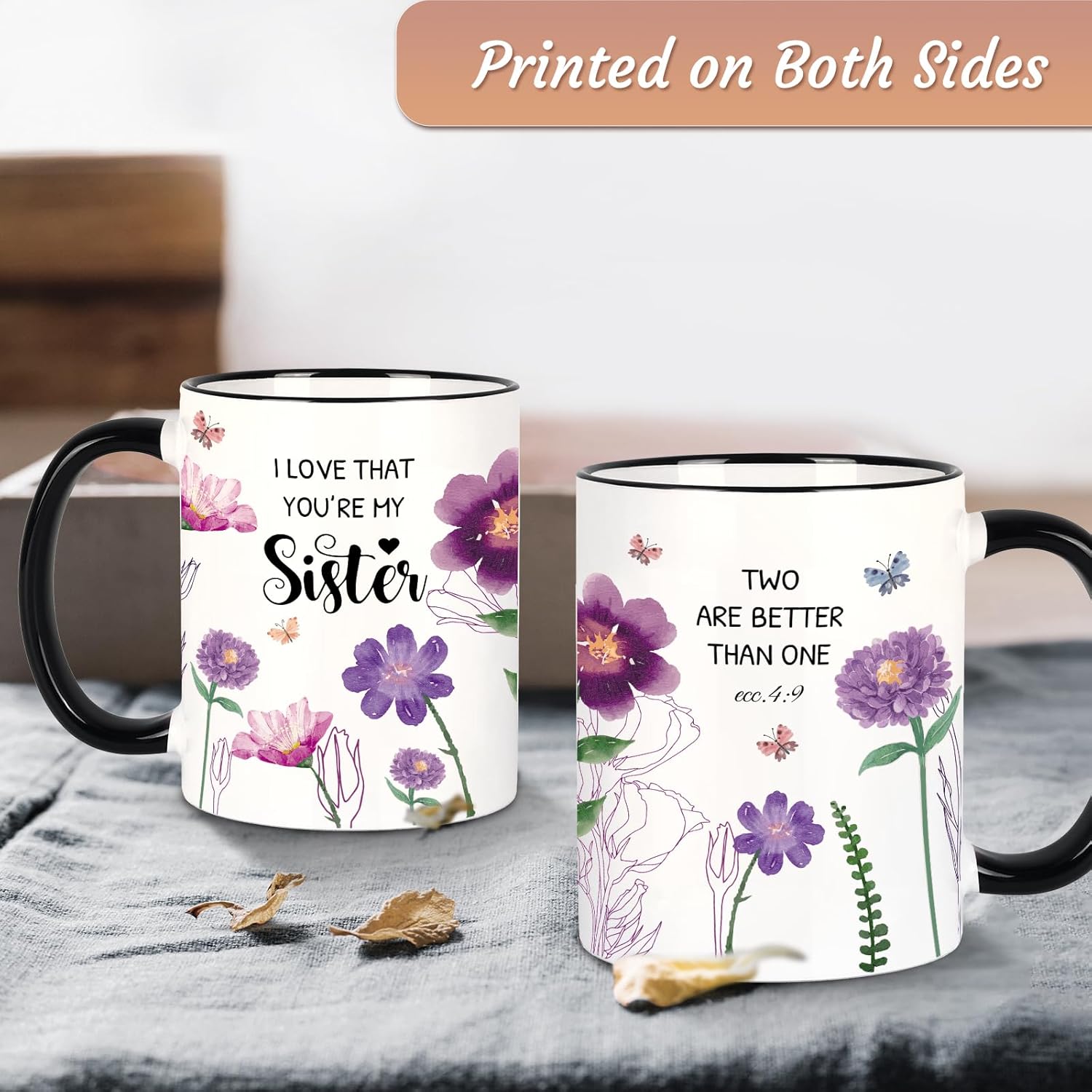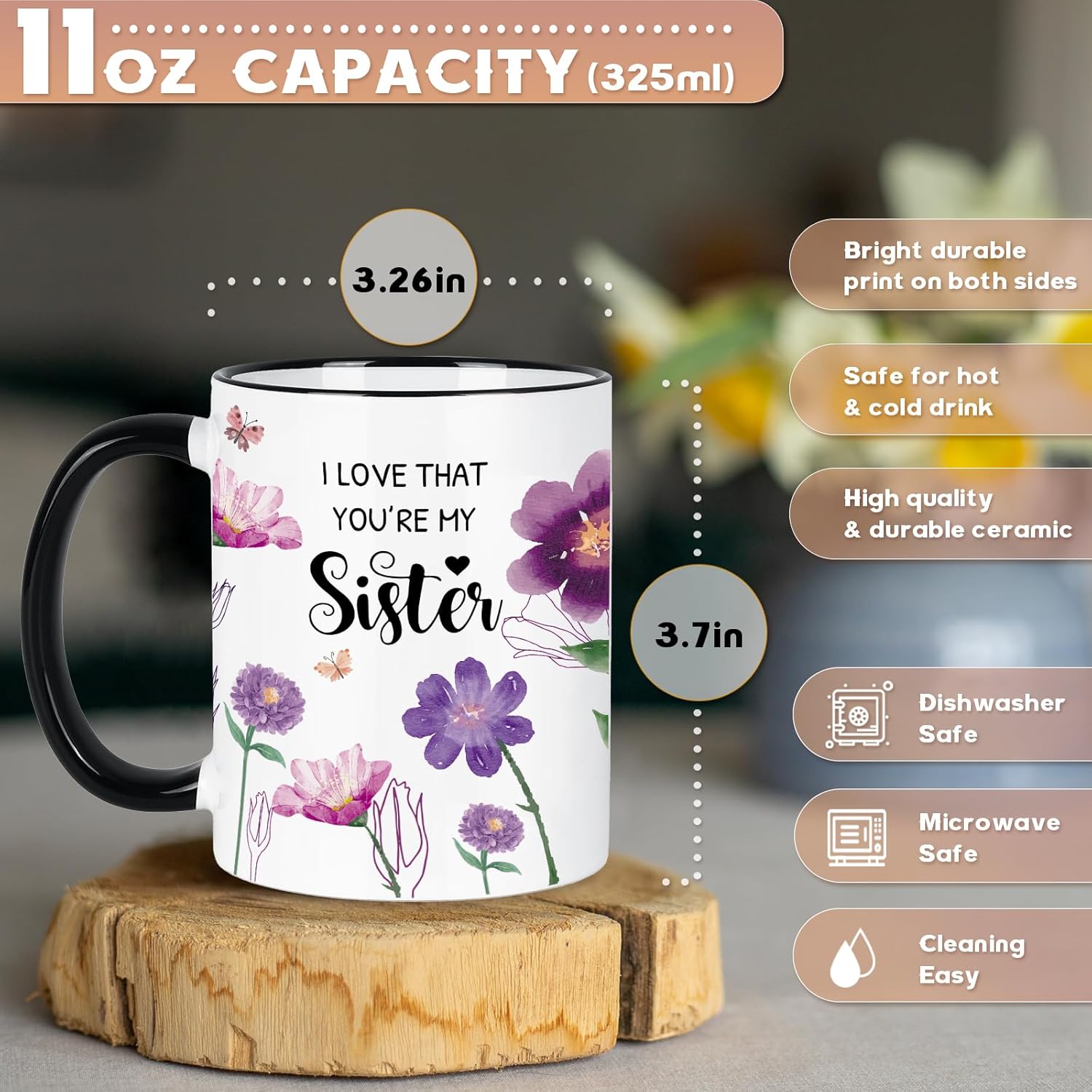 The soft purple flower accents add a calming and graceful touch, while the printed sister message brings sentiment and appreciation into daily beverage routines. Whether enjoyed with morning coffee or afternoon tea, this mug provides comfort and warmth through a thoughtful design.