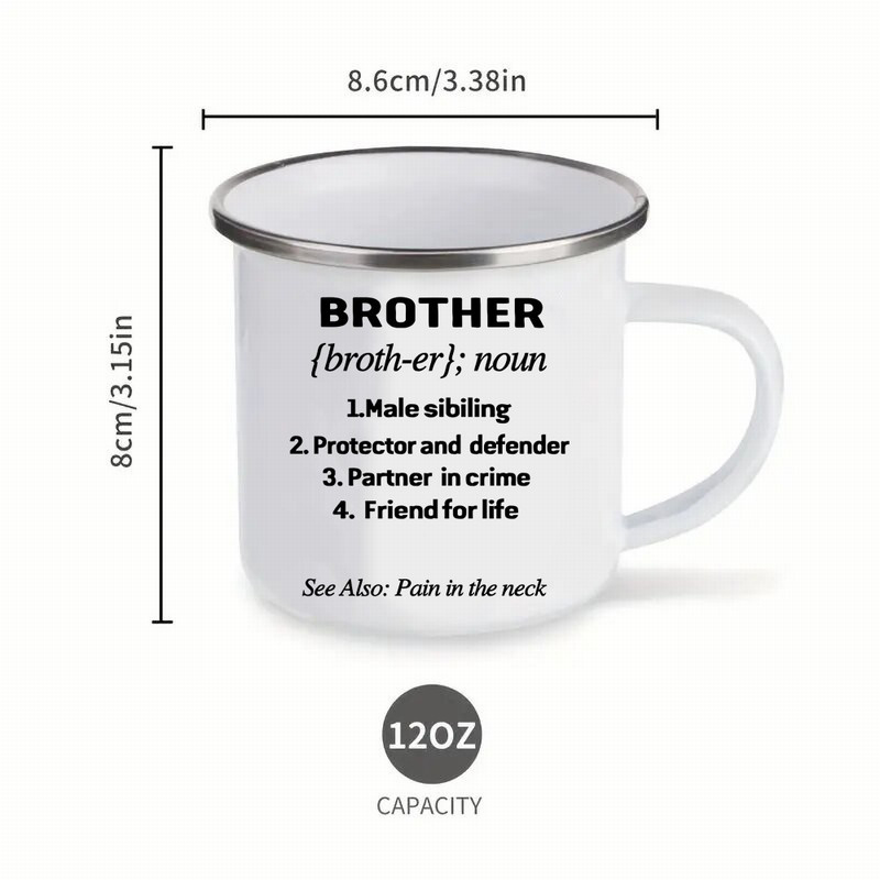 The Funny Brother Definition Style Print 12oz Camping Coffee Cup is a fun and functional drinkware item designed for daily use or outdoor adventures. With its humorous quote design, reusable metal enamel build, and travel-friendly size, it makes an excellent sibling gift for adults. Add personality and laughter to coffee time with this singular brother-themed cup.