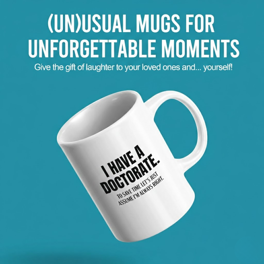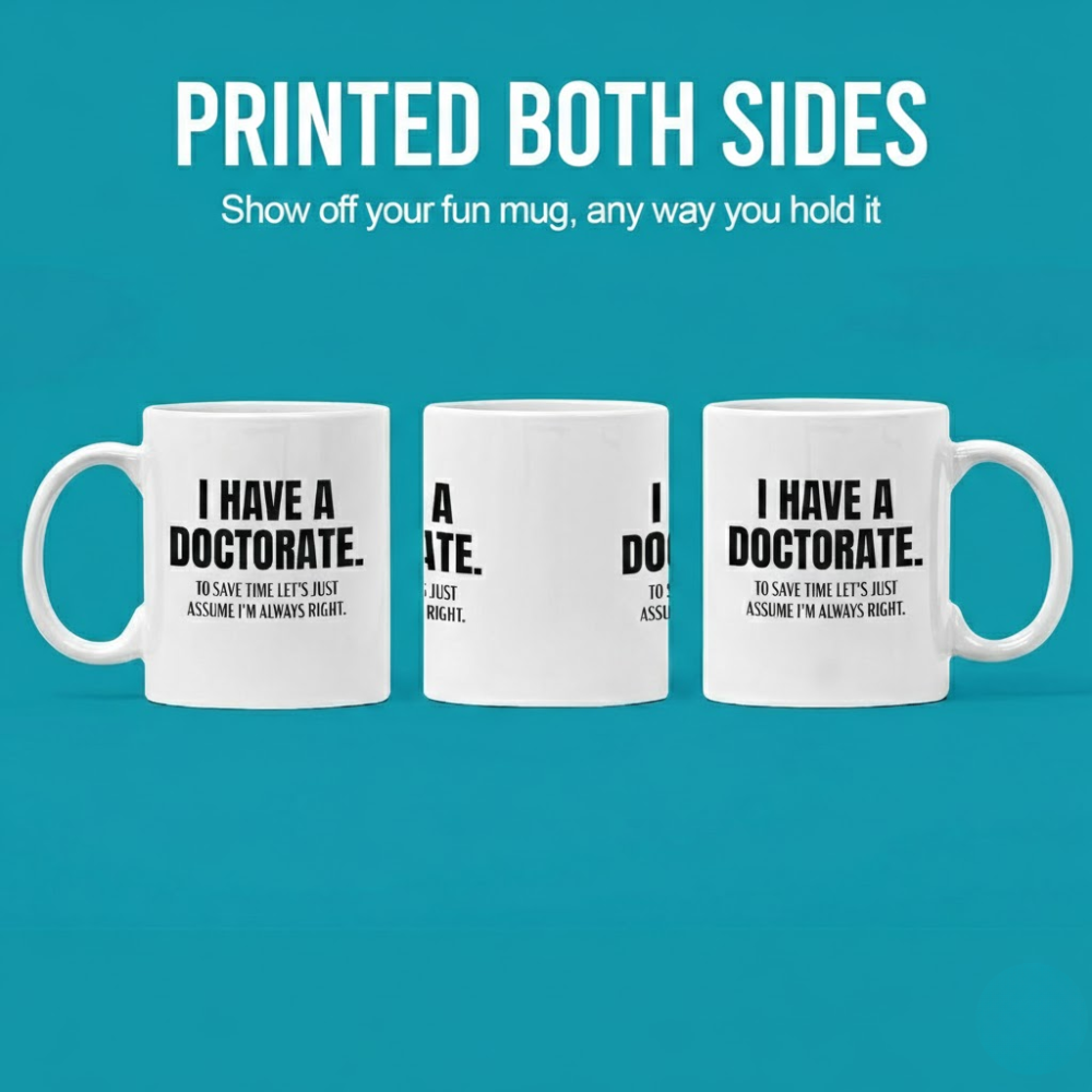 The Doctorate Quote Coffee Mug provides a basic ceramic format with printed text that supports informal recognition of academic completion. With text displayed on both sides, it offers consistent readability regardless of placement.