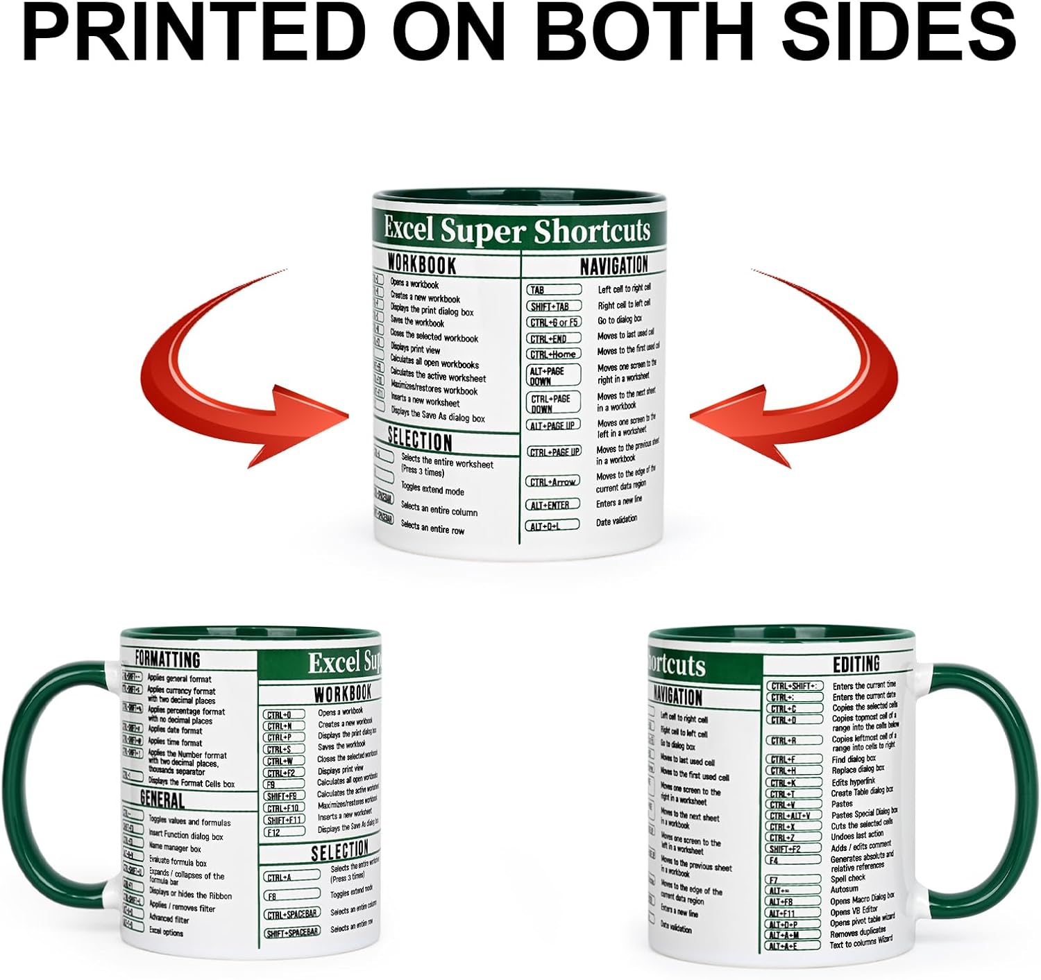 The primary function of this Excel Shortcut Coffee Mug is to provide instant access to spreadsheet shortcuts. The printed guide includes frequently used commands that assist with formatting, navigation, calculations, and data handling.