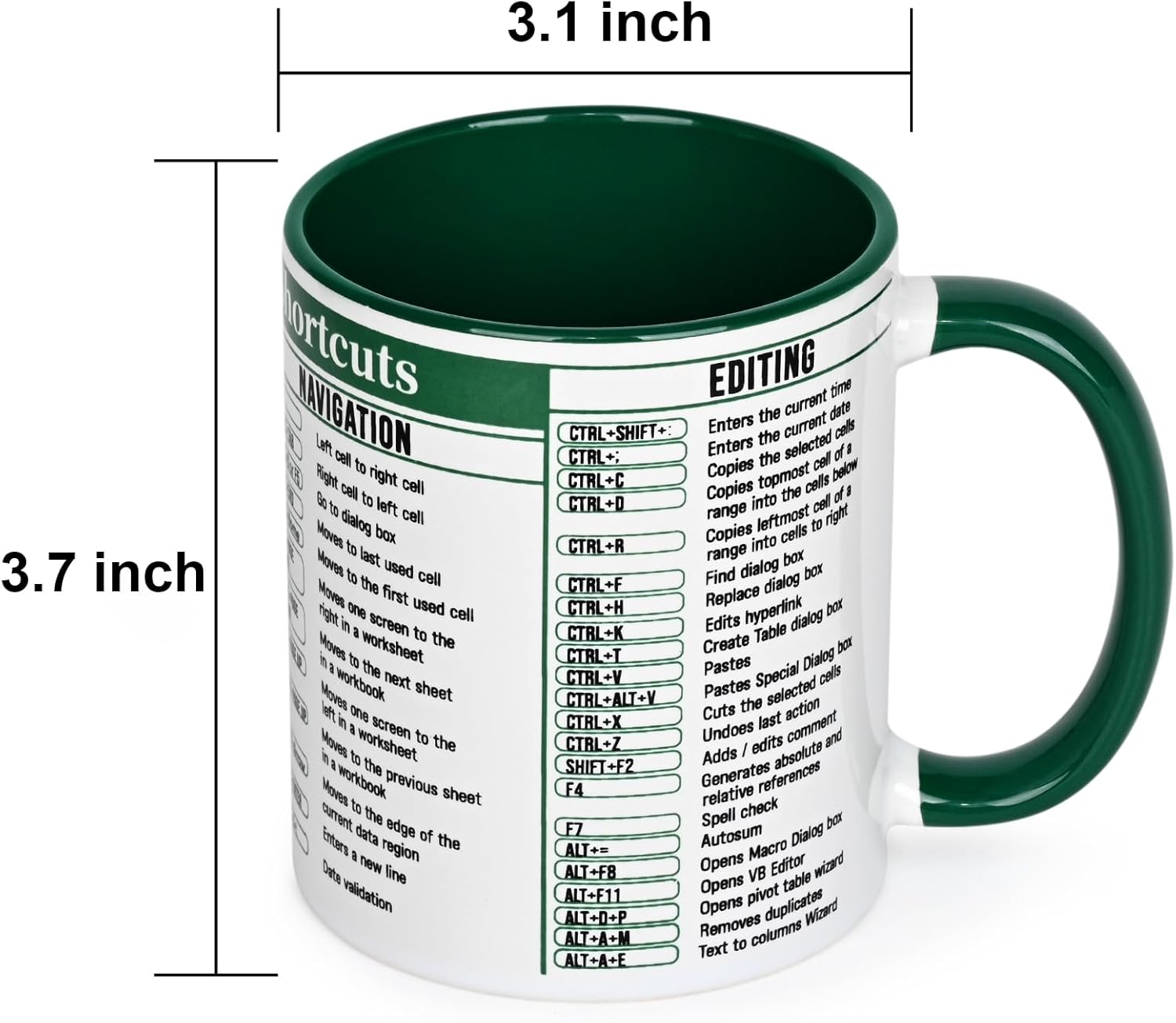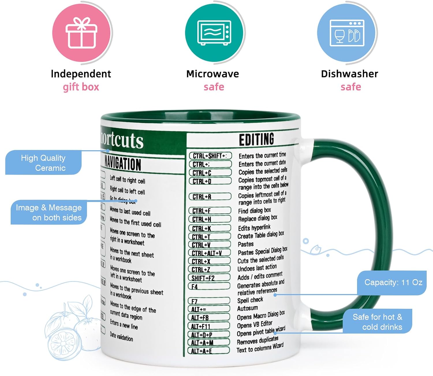 Avoid abrasive tools during cleaning to preserve print clarity. Store in a dry location when not in use.The Excel Shortcut Coffee Mug serves more than one purpose. It functions as daily drinkware while offering an accessible spreadsheet reference. Its porcelain construction, microwave compatibility, and dishwasher suitability make it practical for regular office use.