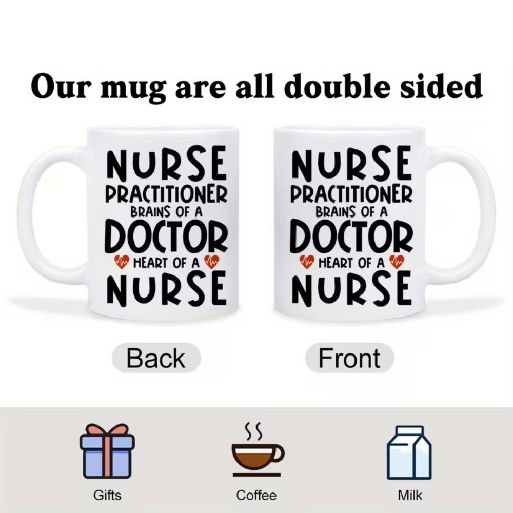 The Funny Nurse Practitioner Themed Coffee Mug For Gift features bold double-sided typography celebrating healthcare professionals. Made from ceramic, it is microwave and dishwasher-compatible for everyday use. Suitable for hot and cold beverages, this mug is ideal for nurse practitioners, staff, and thoughtful appreciation gifts.