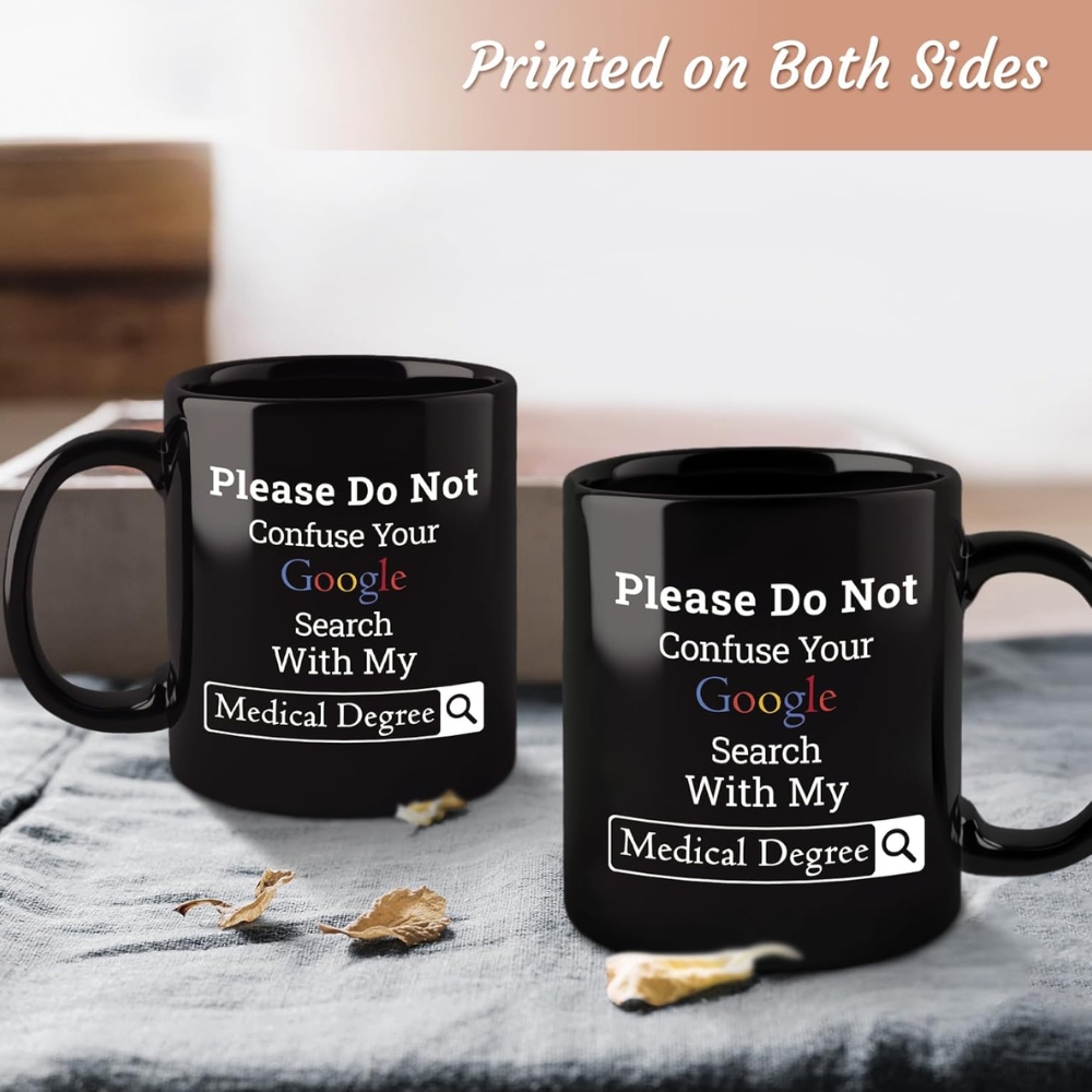 The Funny Nursing Degree With Google Search Themed Coffee Mug features the humorous phrase “Please Do Not Confuse Your Google Search With My Nursing Degree.” Made from glossy black ceramic with double-sided printing, it is microwave and dishwasher compatible. Suitable for nurse graduation, appreciation gifts, birthdays, or Nurses Week, this black nurse coffee cup combines humor with practical everyday use.