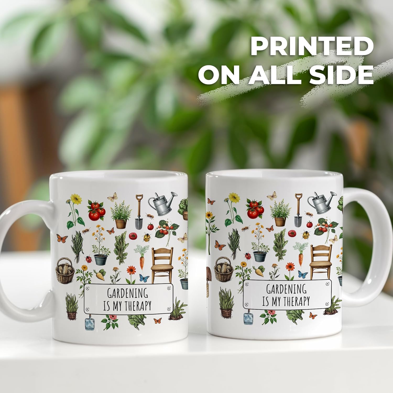 The Gardening Is My Therapy Printed Coffee Mug is designed for those who find peace, balance, and joy in tending their plants. Featuring the phrase “Gardening Is My Therapy,” this beautifully illustrated ceramic mug captures the calming spirit of garden life. Surrounding the message are detailed botanical drawings, including flowers, vegetables, herbs, garden tools, butterflies, and even a cozy wooden chair—creating a charming and immersive garden scene.