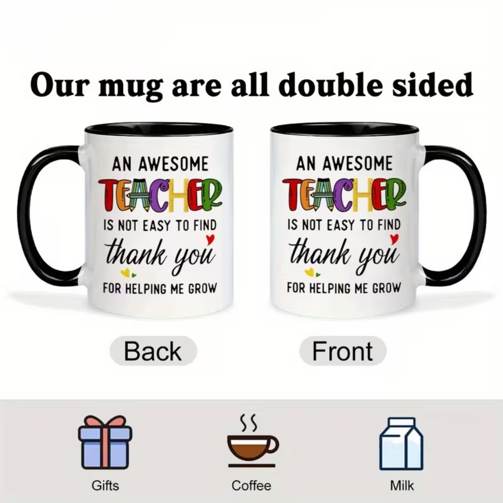 The Teacher Appreciation Coffee Mug is a reusable ceramic 11 oz mug featuring colorful teacher-themed lettering and a printed thank-you style message. It suits hot and cold beverages and works well for desk setups, staff rooms, and home kitchens. As a gift, it fits teacher appreciation occasions, birthdays, graduation-related recognition, and seasonal school events. With routine cleaning and basic care, the printed design can remain clear for repeated daily use.