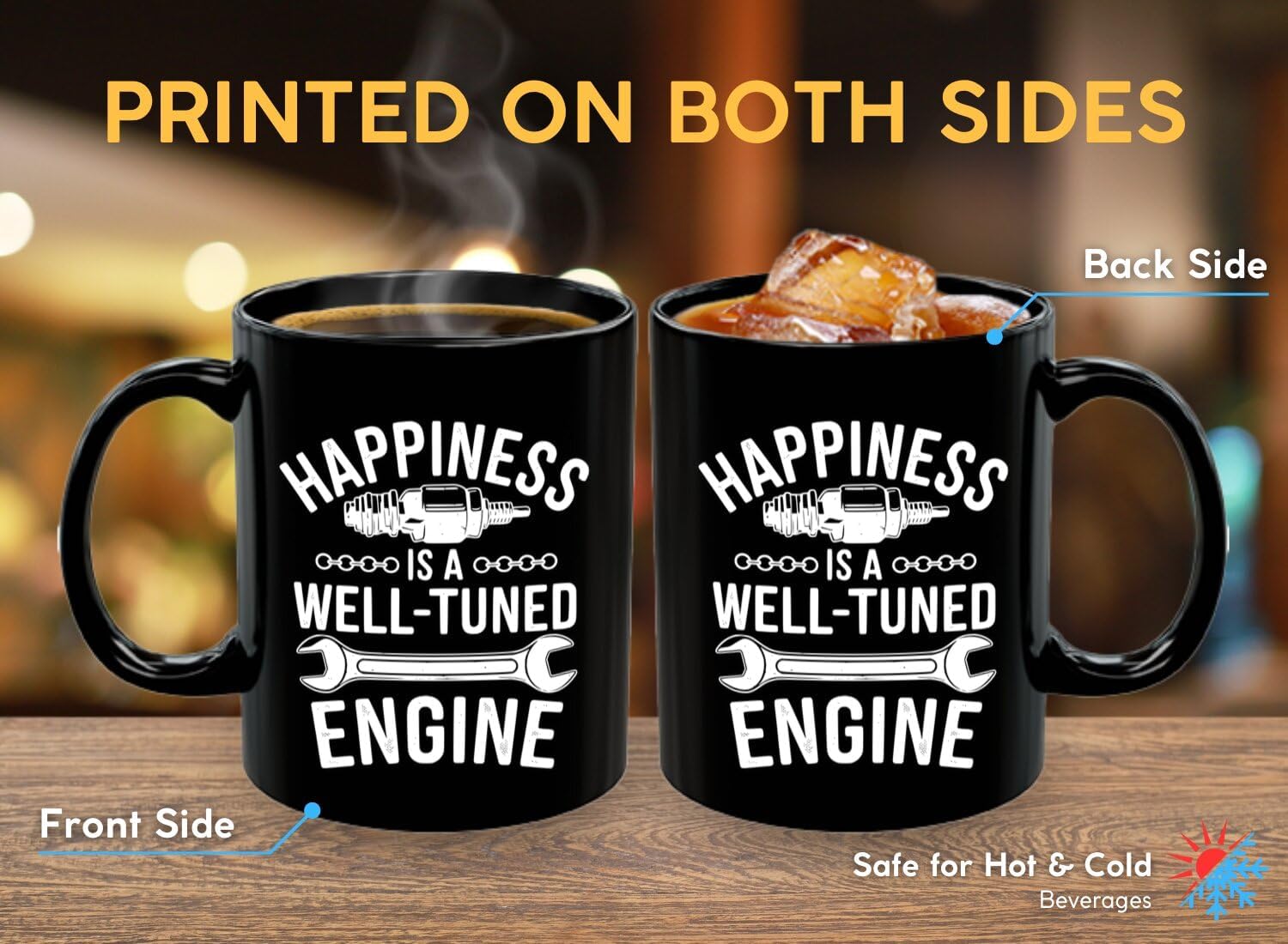 Celebrate mechanical passion with every sip. The Well Tuned Engine Mug is a black ceramic coffee cup featuring the quote “Happiness Is A Well-Tuned Engine” with spark plug and wrench graphics. Available in 11 oz and 15 oz sizes, it is microwave and dishwasher compatible. Ideal as a mechanic coffee gift, it combines automotive style with daily practicality.