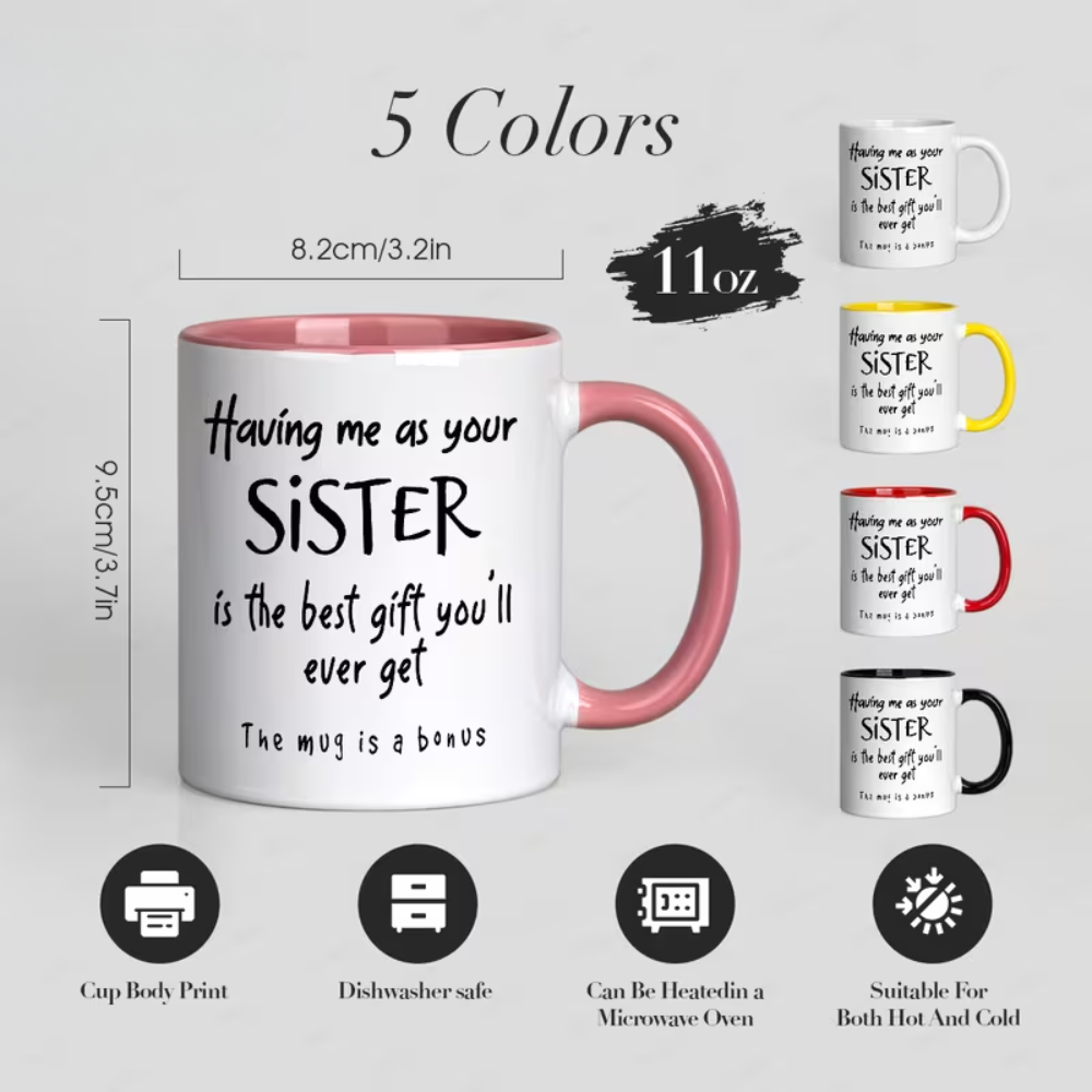 Celebrate sisterhood with a lighthearted touch using this Having Me As Your Sister Quote Print 11oz Ceramic Coffee Mug. Featuring a humorous message in whimsical script, it makes a memorable gift for birthdays, holidays, or simple appreciation. The message reads: “Having me as your sister is the optimal gift you’ll ever get – the mug is a bonus,” bringing both fun and sentiment to your gift-giving.