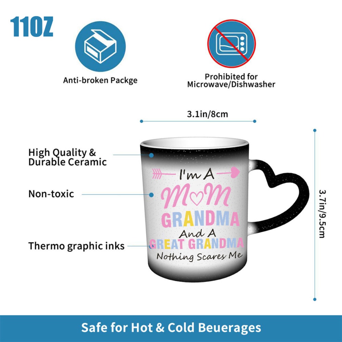 The Heat Reveal Message Mug For Grandma is a ceramic beverage mug designed with a heat-activated effect that changes the appearance of the exterior when a warm drink is added. This type of mug adds an interactive touch to daily drink routines, revealing the printed design more clearly as the mug warms. The front message is created for moms, grandmas, and great grandmas, making it suitable for family gifting moments as well as everyday use at home. The mug’s round shape and classic handle make it easy to use for coffee, tea, cocoa, and other warm beverages, while the reusable ceramic build supports repeat use. It is also suited to living room use, kitchen use, and desk setups where a warm drink is part of the routine. Because the mug is designed with a color-changing surface, the care guidance focuses on gentle cleaning methods to help maintain the finish and printed design over time.
