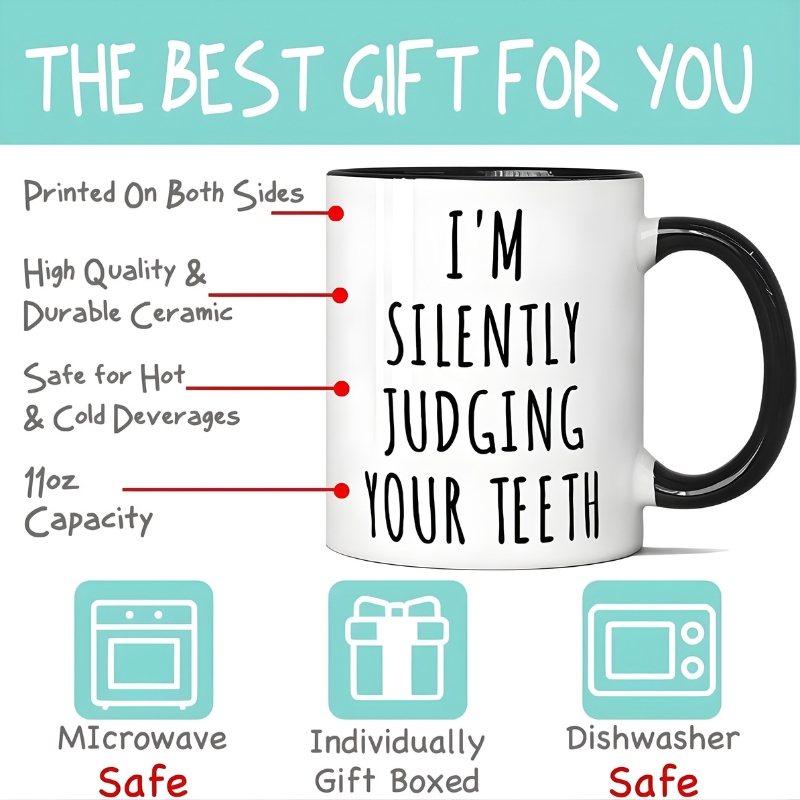 The printed phrase is integrated directly into the material for long-lasting visual clarity. It’s suitable for environments like desks, break rooms, or casual dining spaces. The mug’s print reads: “I Am Silently Judging Your Teeth,” serving as a statement piece that aligns with humor often found in professional and casual contexts.