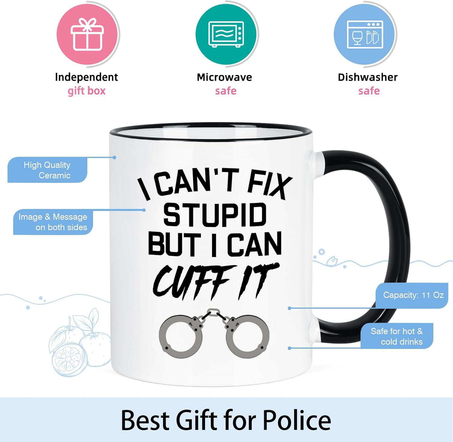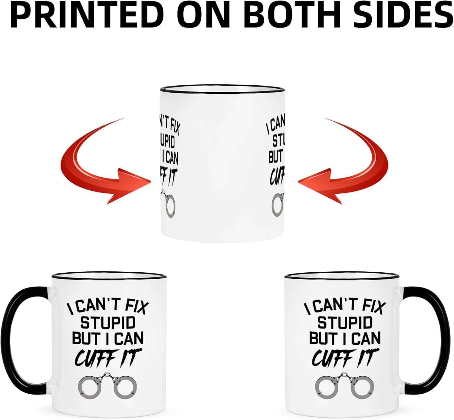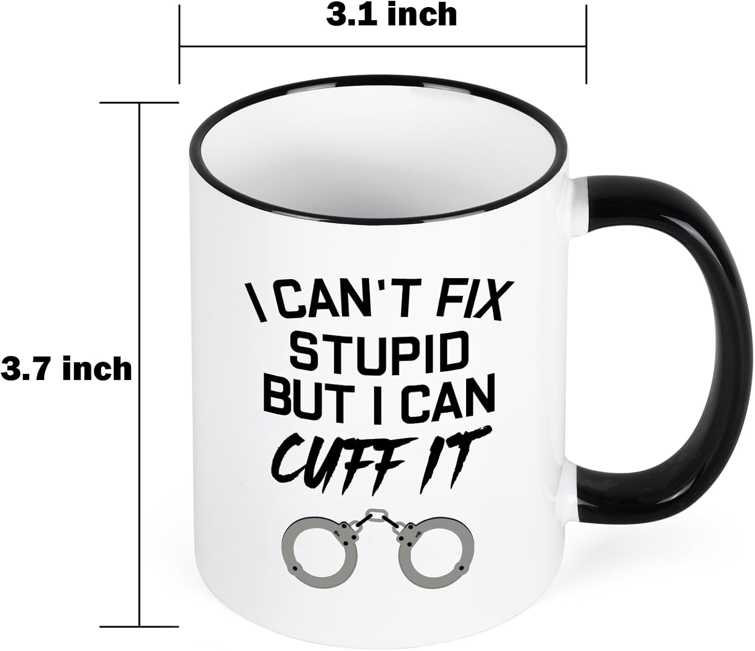This I Can Not Fix Stupid But I Can Cuff It Printed Coffee Mug features the bold “I Can’t Fix Stupid But I Can Cuff It” design with handcuff graphic. Crafted from ceramic with a black handle and rim, it holds 11 ounces and is microwave and dishwasher compatible. A perfect Law Enforcement Gift, Correctional Officer Coffee Mug, or Police Academy Graduation Gift for men and women. This I Can Cuff It Mug is a fun and practical gift for any law enforcement professional. The bold lettering and simple handcuff graphic create a strong visual impact while keeping the design clean and modern.