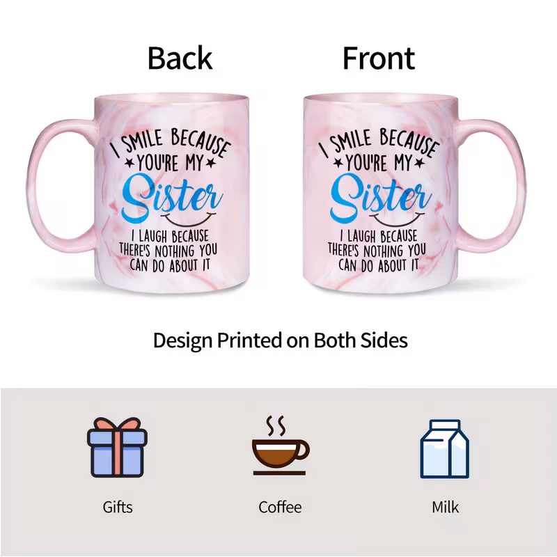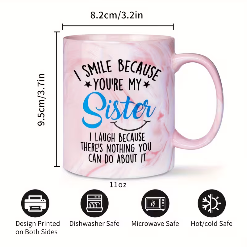 Its reusable ceramic design supports daily coffee or tea routines while offering a meaningful message that celebrates sibling connection. Whether given as a holiday present or kept as a personal mug, it brings fun and warmth into everyday moments. The combination of cheerful text and elegant marble styling makes it a standout choice for anyone searching for a memorable sister-themed gift.