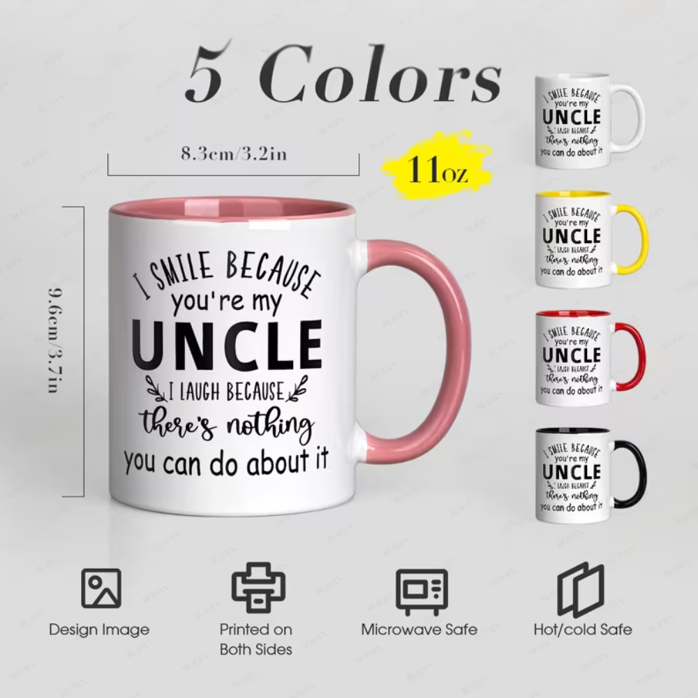 The Funny Uncle Quote Mug is a message-themed ceramic mug designed for daily beverages and family gifting. With a clear printed quote, two-tone accent details, and an 11oz capacity, it suits hot and cold drinks at home or at work. Its reusable format and dishwasher-compatible care support regular use throughout the year, making it suitable for birthdays, holiday gatherings, and family celebrations.
