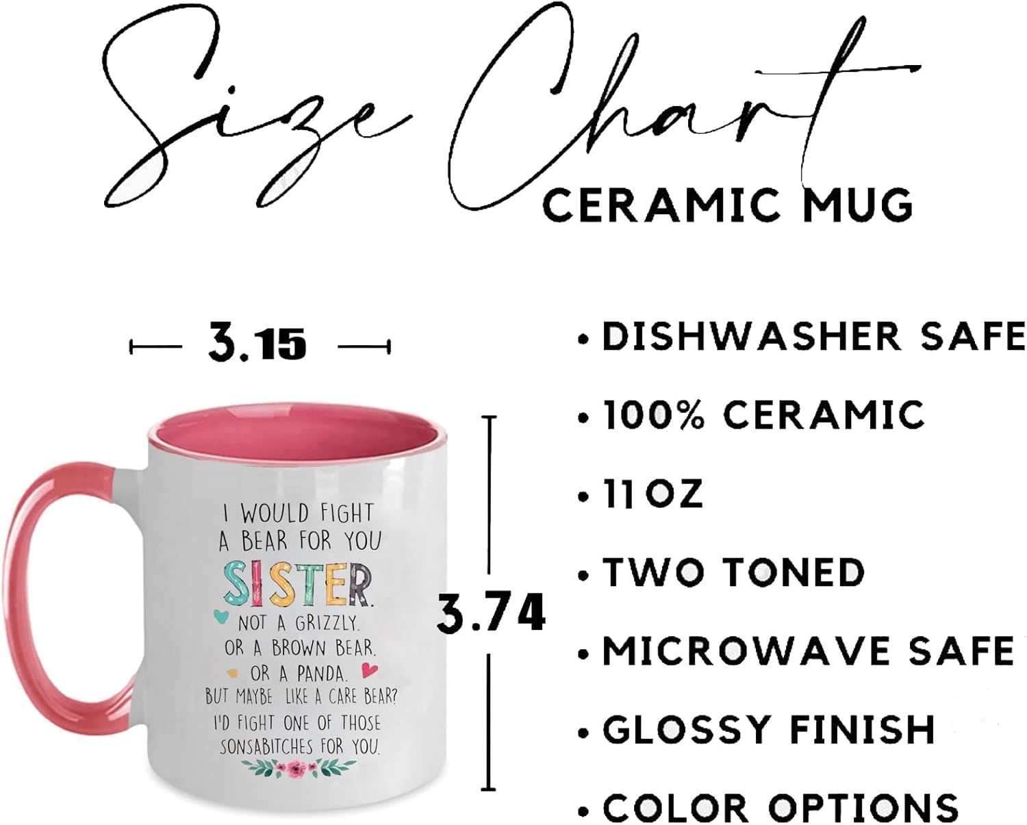 The I Would Fight a Bear For You Sister Quote Print 11oz Ceramic Coffee Mug is a whimsical and practical drinkware gift designed for sibling celebrations and everyday beverage enjoyment. With its humorous message, reusable ceramic build, microwave safe feature, and double-sided print, it is a great choice for birthdays, Christmas gifting, and fun daily coffee moments.