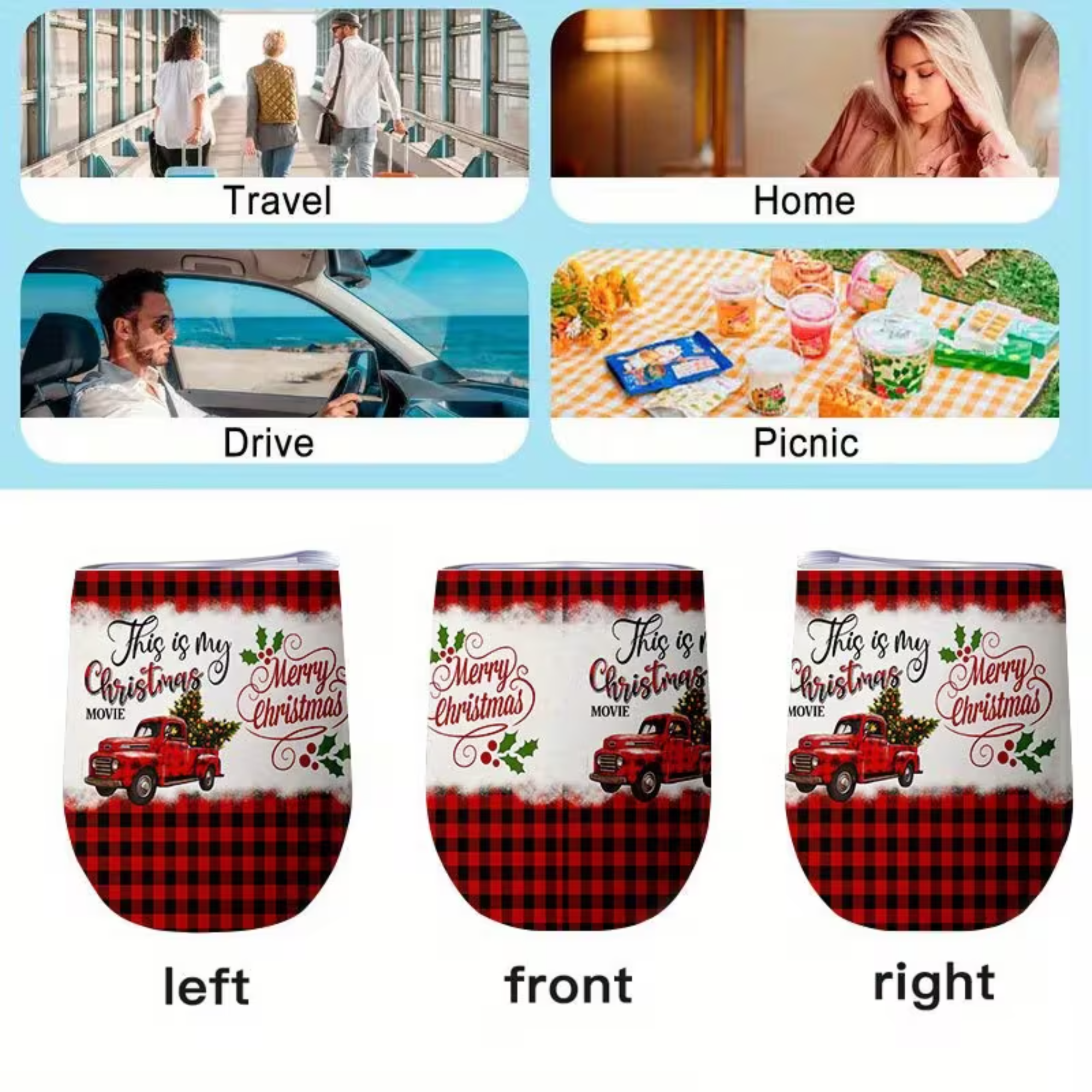 The leak-proof lid allows confident use during travel or outdoor activity. The tumbler’s 12oz size works well for hot drinks during cold weather and chilled drinks during warmer moments. Its printed Christmas movie text creates a fun seasonal connection, making it a great companion for movie nights or holiday gatherings.