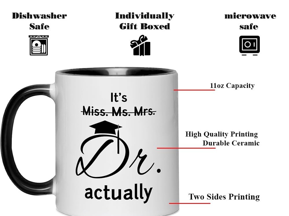Celebrate milestones with this Its Miss Ms Mrs Doctor Actually Quote Printed 11 Oz Coffee Mug, created to honor titles that reflect years of academic work. Designed with a sharp printed phrase, the cup displays the message "It's Miss Ms Mrs Doctor Actually," crafted for those who earned recognition and identity through their achievements.