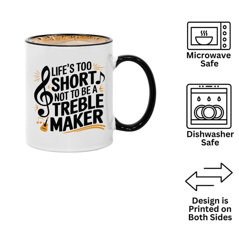The Treble Maker Music Mug supports convenience and everyday usability. Its ceramic build helps maintain beverage temperature for short to moderate periods. The handle design allows stable grip while drinking.Because the print appears on both sides, it remains visible regardless of orientation. This detail adds to its suitability as a desk companion or display item.