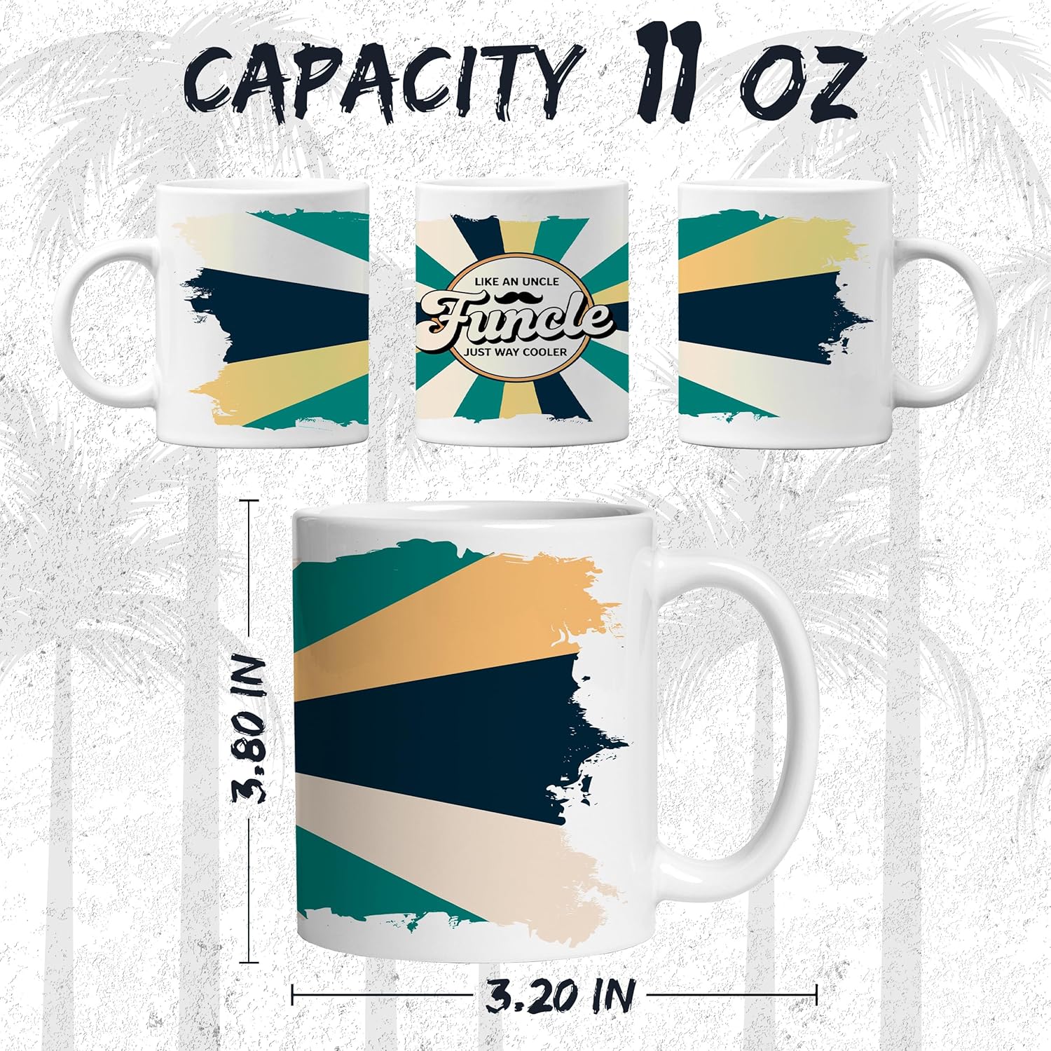 This Like An Uncle Funcle Just Way Cooler Printed Coffee Mug features a bold central design paired with a radial background pattern that enhances visual contrast. The layout keeps the printed text clearly defined, making the mug easy to read from multiple angles. Its cylindrical form allows it to sit securely on flat surfaces, while the handle provides steady support during use. The ceramic material offers a smooth surface that complements the printed artwork.