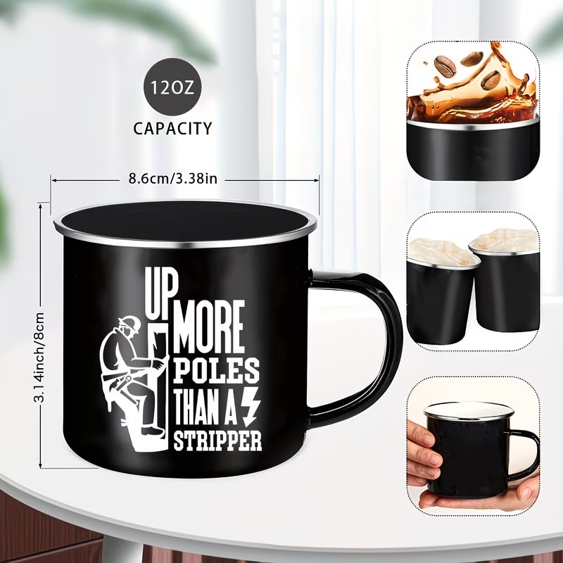 The Lineman Pole Humor Mug is a 12oz enamel coffee mug featuring a lineman pole-climbing silhouette and bold humor text theme. With its camp-style shape, reusable format, and clear graphic layout, it fits coffee breaks at home, in the office, or outdoors. Care is simple—wash only with warm water and mild dish soap, use a soft sponge, and dry fully before storing to help keep the print looking clear over time.