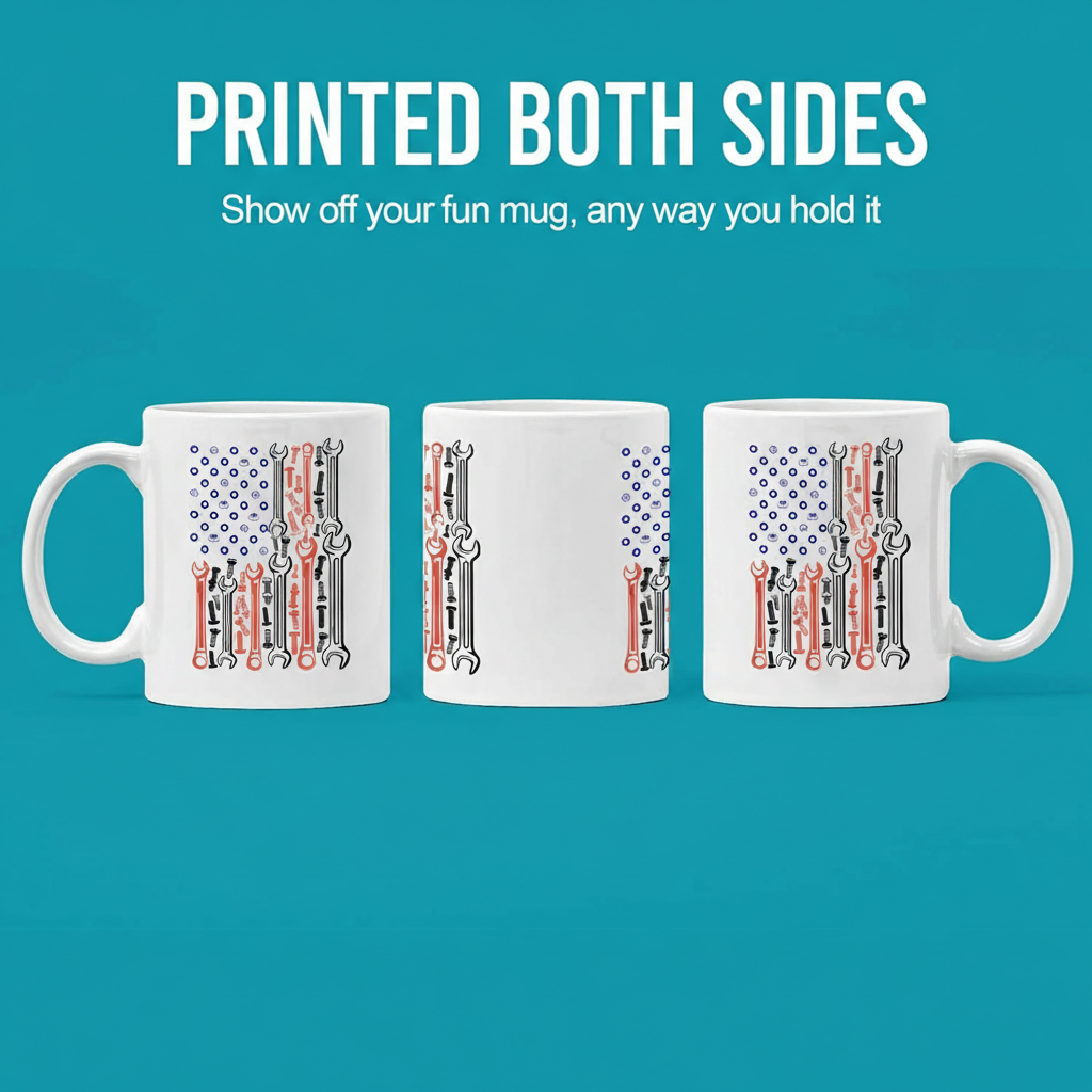 The Mechanic American Flag Mug is a functional 11oz ceramic cup that blends automotive craftsmanship with American pride. Featuring a USA flag graphic formed from wrenches and bolts, it represents dedication to both trade and country. With microwave and dishwasher compatibility, double-sided printing, and versatile use options, it fits seamlessly into kitchens, garages, and offices.
