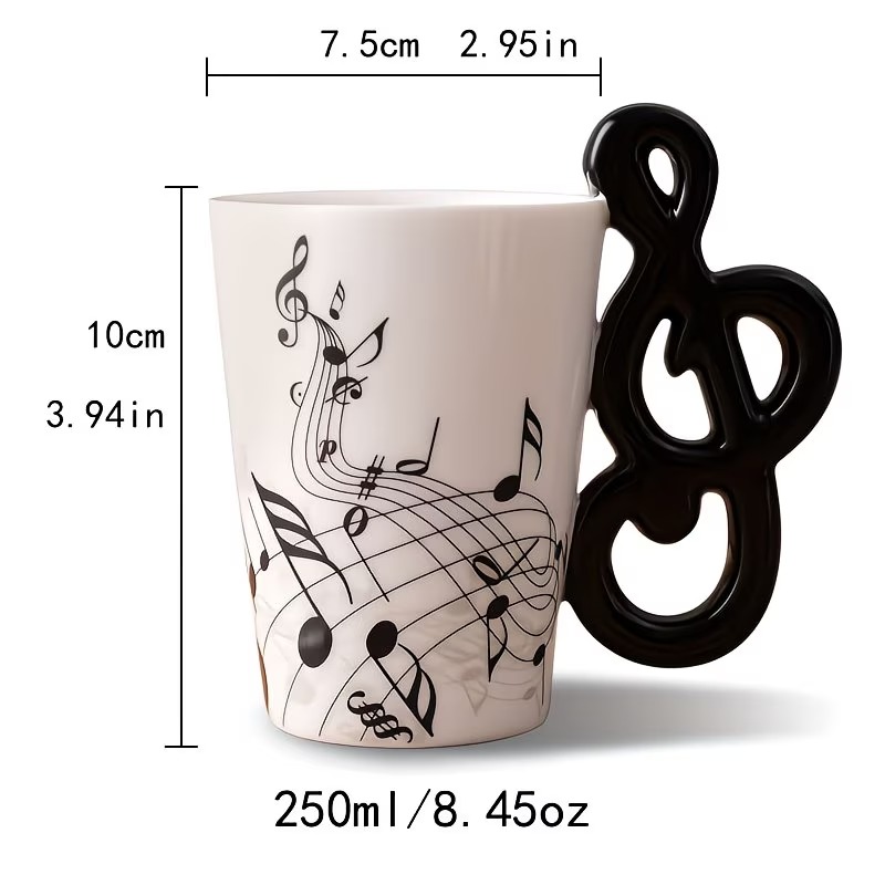 With a 250ml / 8.45oz capacity, this mug is suitable for coffee, tea, hot chocolate, and chilled beverages. Its compact size fits morning routines, quick refreshment breaks, and casual gatherings. The music-themed artwork paired with the distinctive handle creates a balanced blend of novelty and function.