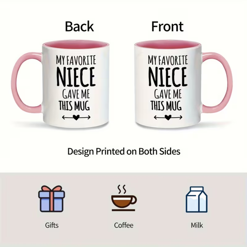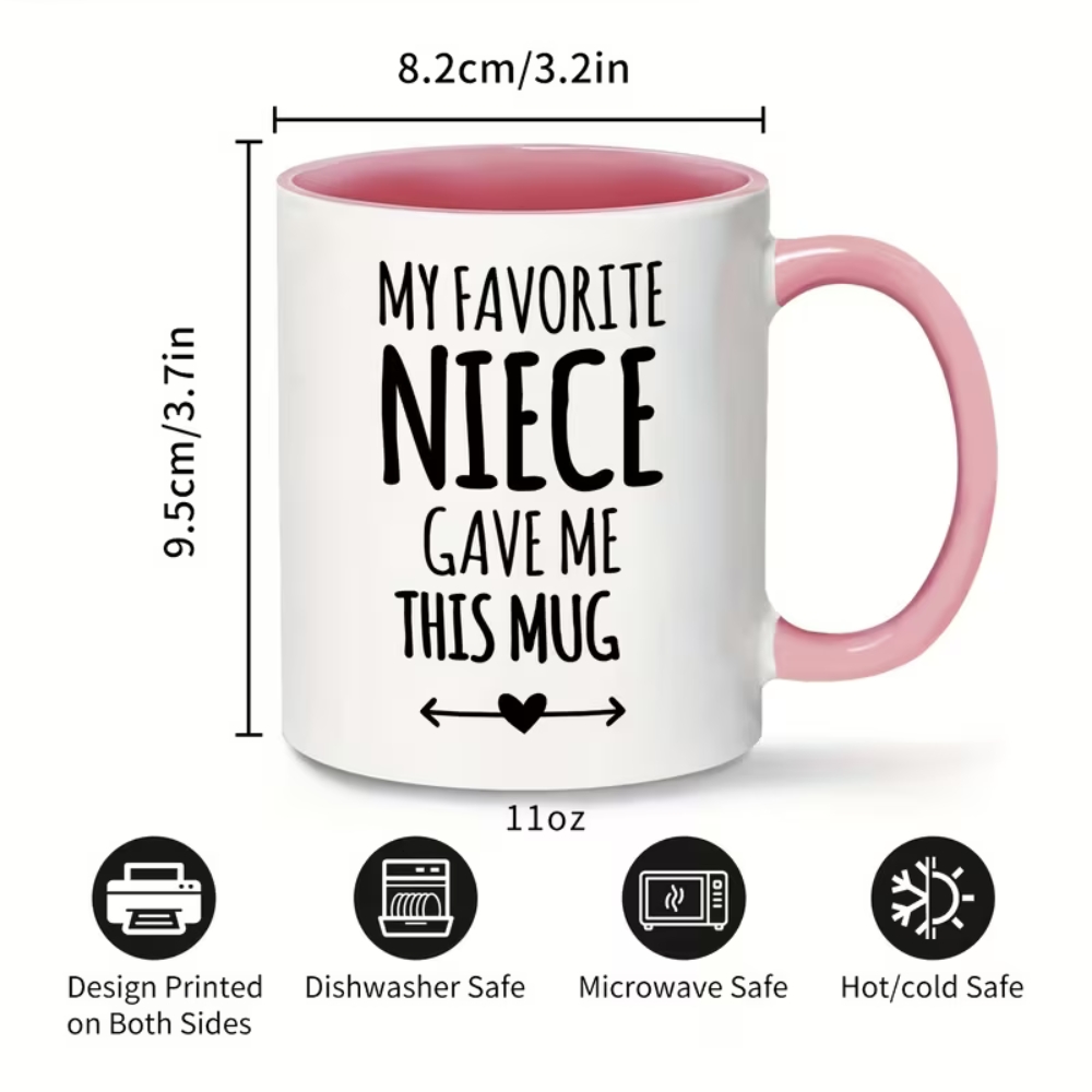 The Niece Gift Coffee Mug is an 11oz ceramic message mug designed for everyday beverages and family gifting. With a centered printed text design, reusable format, and microwave and dishwasher compatibility, it supports convenient daily routines at home or at work. Suitable for hot and cold drinks and multipurpose use, it fits gift occasions across the year, including birthdays, anniversaries, and seasonal gatherings.