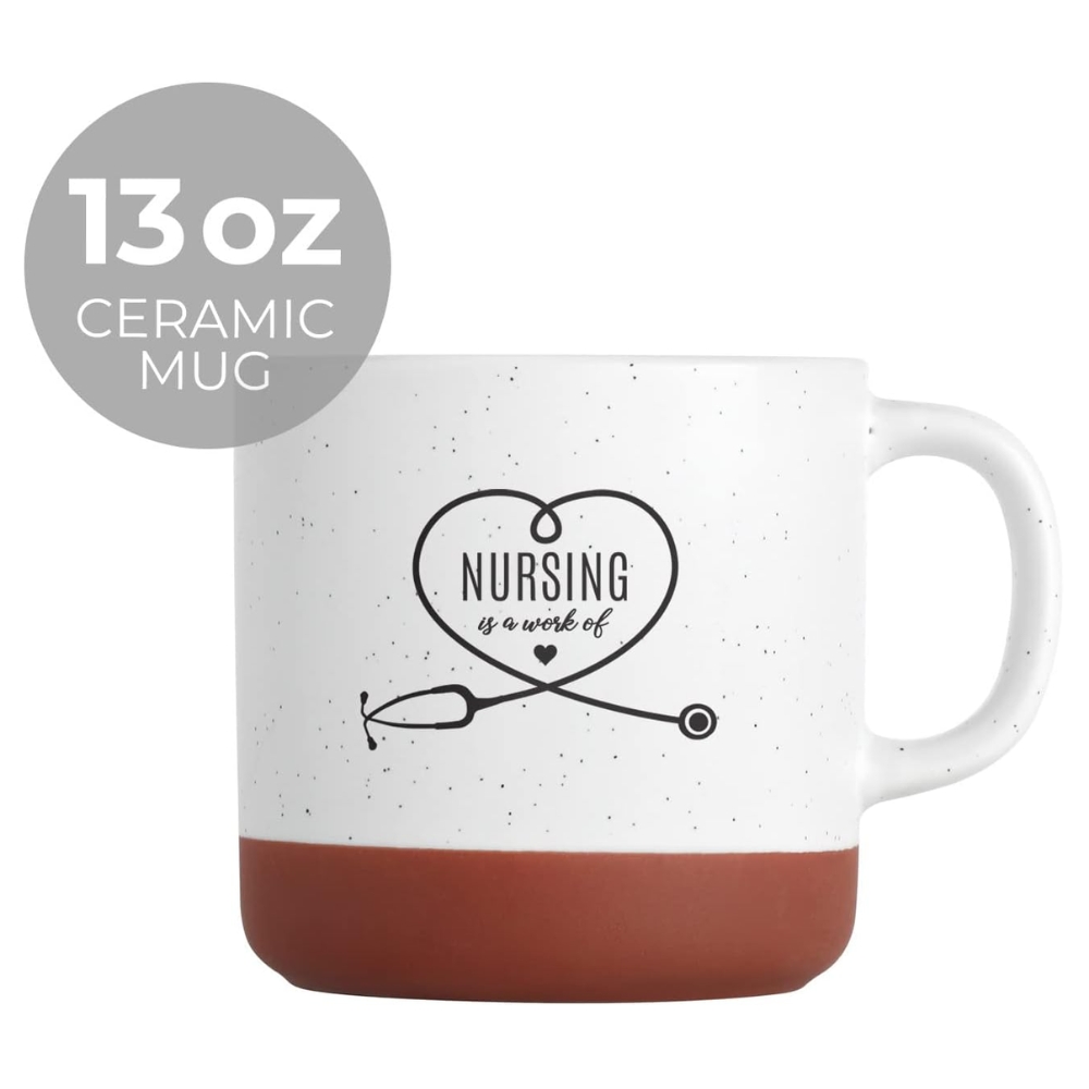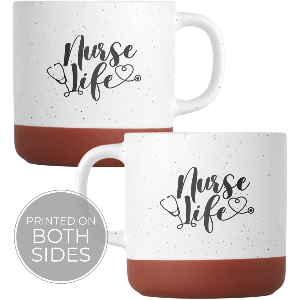 The Nurse Life Printed Ceramic Coffee Mug features a speckled farmhouse design with a stethoscope graphic. Made from ceramic with a satin finish and unglazed brown base, it offers a distinctive look. Microwave compatible and suitable for daily hot or cold beverages, this nurse appreciation mug is ideal for RNs, LPNs, and nursing students.