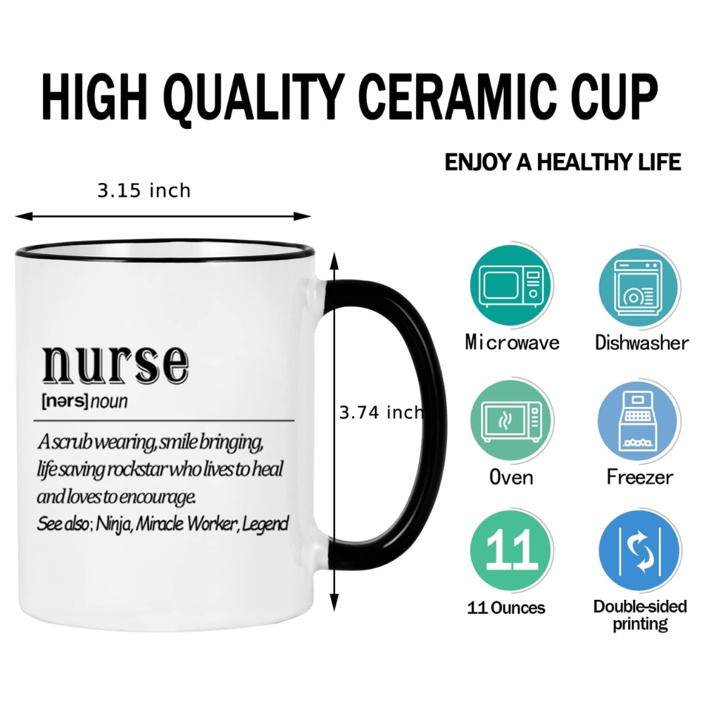 The porcelain material provides a refined finish while maintaining strength for daily routines. The black handle adds a stylish contrast that stands out from standard white mugs. The printed definition celebrates the dedication and encouragement nurses bring to their profession.