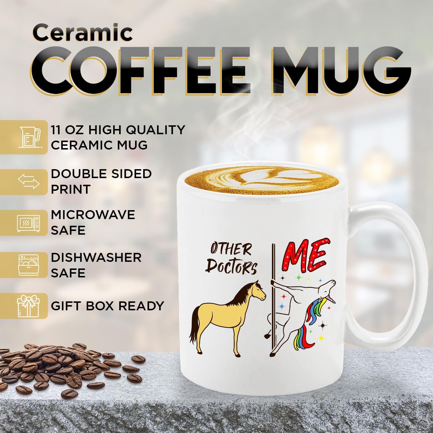 This Other Doctors Vs Me Unicorn Printed Message 11 Oz Ceramic Coffee Mug presents a message in a compact design. It blends novelty visuals with functional use. Built with a standard 11 oz capacity, the mug supports daily routines involving warm or room-temperature beverages. The design features a whimsical unicorn illustration paired with text for visual interest.