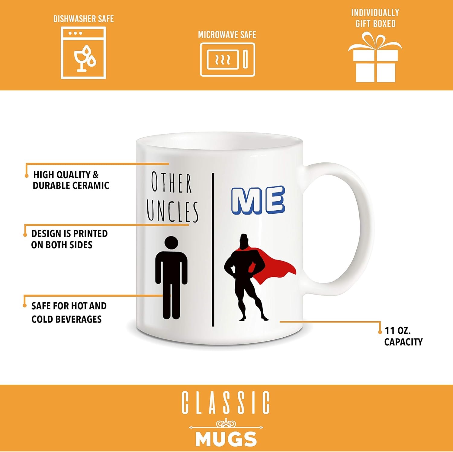 Wash before first use. The Other Uncles Versus Me Theme Coffee Mug For Uncle is suitable for dishwasher cleaning under standard cycles and can be used in a microwave for reheating beverages. Avoid abrasive cleaners or scouring pads to help preserve the printed artwork. Dry thoroughly before storage.