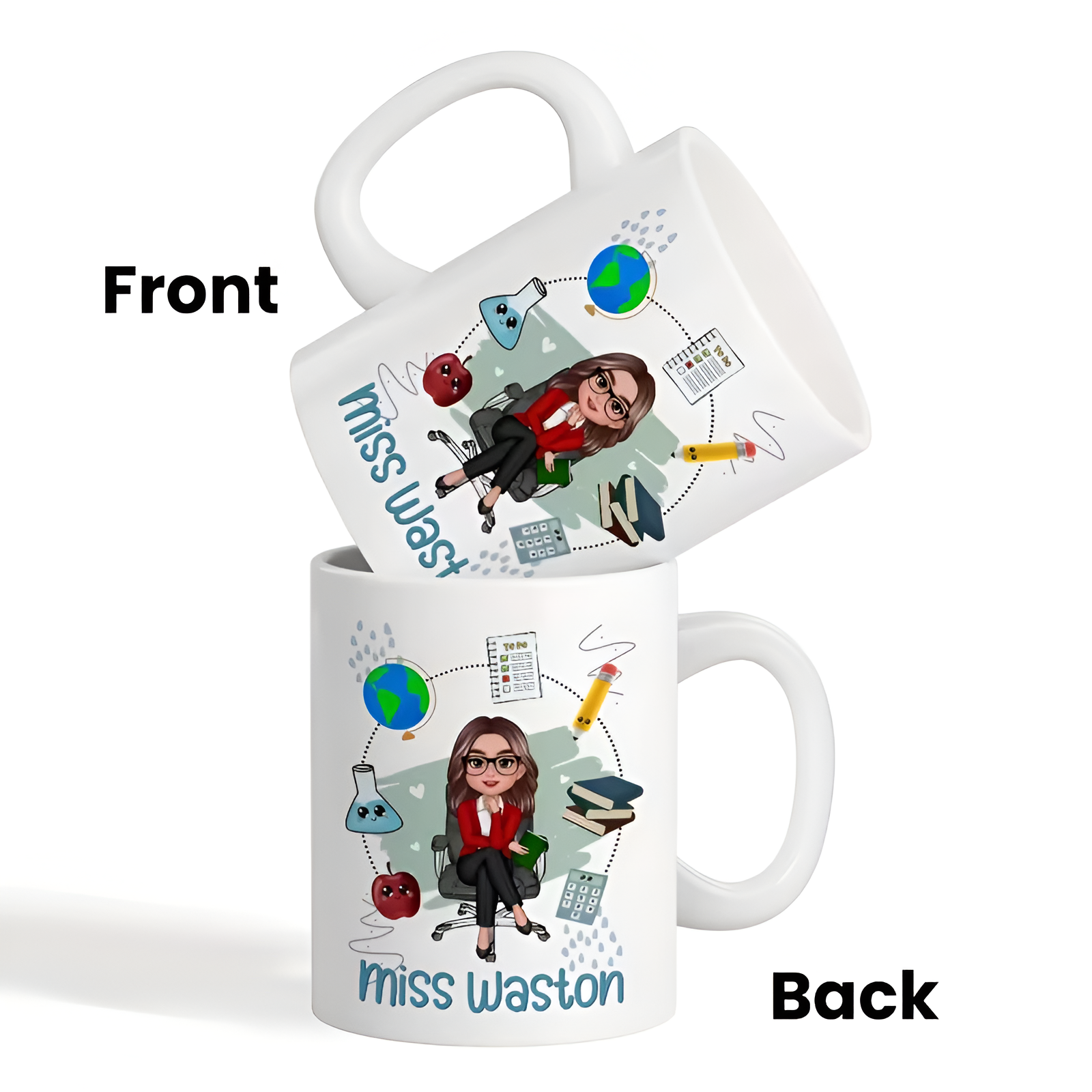 A ceramic mug is a familiar format that supports repeated use, and the printed name helps reduce the chance of the mug being mistaken for someone else’s cup. This is helpful in shared classroom environments and staff areas where multiple people may use the same counters and storage spaces. The teacher-themed design also makes it a fitting desk item that can be used throughout the school year, supporting daily beverage routines during meetings, grading sessions, and preparation time.