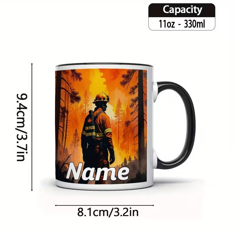 The Personalized Firefighter Forest Mug stands out through its forest scene artwork paired with customizable text. Many firefighter-themed mugs focus on simple symbols, but this design uses a full scene with trees, warm sky tones, and a firefighter figure to create a display-ready look that remains clear on a desk or shelf. The customizable text adds a personal layer that makes the mug feel assigned to one person, which is helpful in shared kitchens, offices, and station common areas.