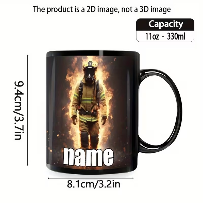 The Personalized Firefighter Name Mug is an 11oz ceramic mug featuring a firefighter hero graphic and custom name text on the front. Designed for coffee, tea, juice, water, and more, it fits everyday use at home, at work, or in shared spaces. With reusable ceramic construction, microwave compatibility, and dishwasher compatibility, it offers a clear firefighter theme plus practical daily function, making it a solid personalized gift option for firefighters, first responders, and supporters.